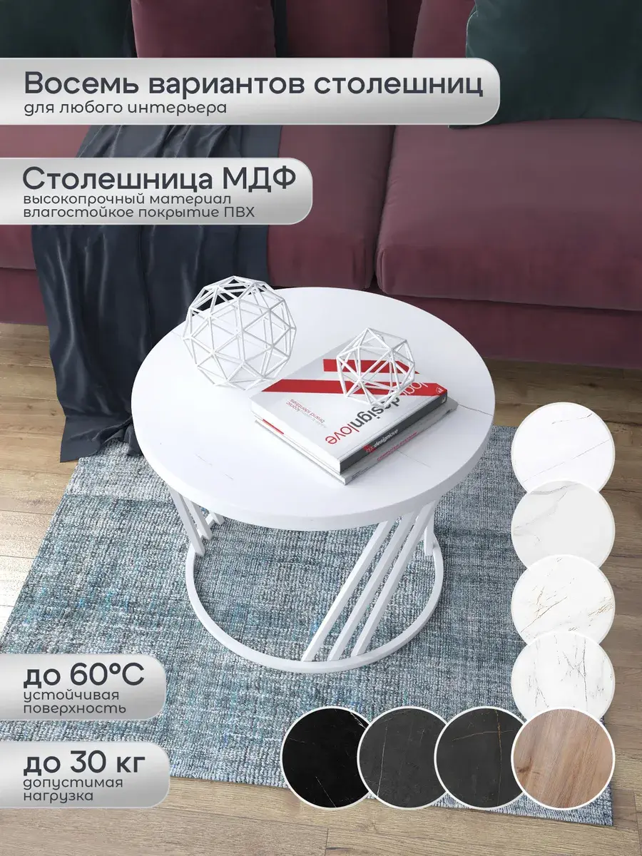 Журнальный стол "Адидас" — это стильное и функциональное дополнение к вашему интерьеру. Его уникальный дизайн и высокое качество сразу привлекают внимание. Столешница влагостойкая, а основание покрыто прочной полимерно-порошковой краской. Благодаря этому он не только привлекательно выглядит, но и очень практичен. Конструкция столика надёжна, он выдерживает нагрузку на столешницу до 30 кг. Это позволяет разместить на нём различные предметы декора или напитки. Цвет основания: белый, столешницы: мрамор белый глянцевый. Основание выполнено из квадратной профильной трубы 15х15 толщиной 1.2мм Этот журнальный столик удобен в использовании. Он не царапает пол и не шатается, обеспечивая дополнительный комфорт при эксплуатации. Производство в России гарантирует высокое качество товара и его соответствие всем стандартам. Кроме того, столик поставляется уже собранным. Вам не придётся тратить время и силы на его сборку. Просто распакуйте его и наслаждайтесь преимуществами этого прекрасного изделия. Круглый журнальный столик со столешницей под мрамор — это не просто мебель. Это настоящее произведение искусства, которое подчеркнёт ваш вкус и станет главным акцентом в вашем доме. Покупая этот столик, вы получаете не только функциональную мебель, но и предмет декора, который добавит шарма и уюта в ваше пространство. Не упустите возможность купить этот уникальный журнальный столик и создать уютный уголок в вашем доме, который будет радовать вас каждый день.