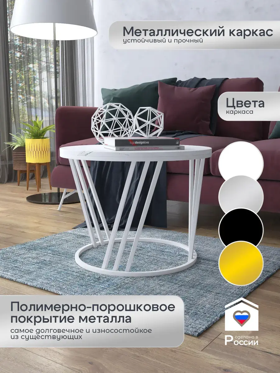 Журнальный стол "Адидас" — это стильное и функциональное дополнение к вашему интерьеру. Его уникальный дизайн и высокое качество сразу привлекают внимание. Столешница влагостойкая, а основание покрыто прочной полимерно-порошковой краской. Благодаря этому он не только привлекательно выглядит, но и очень практичен. Конструкция столика надёжна, он выдерживает нагрузку на столешницу до 30 кг. Это позволяет разместить на нём различные предметы декора или напитки. Цвет основания: белый, столешницы: мрамор серебро белый матовый. Основание выполнено из квадратной профильной трубы 15х15 толщиной 1.2мм Этот журнальный столик удобен в использовании. Он не царапает пол и не шатается, обеспечивая дополнительный комфорт при эксплуатации. Производство в России гарантирует высокое качество товара и его соответствие всем стандартам. Кроме того, столик поставляется уже собранным. Вам не придётся тратить время и силы на его сборку. Просто распакуйте его и наслаждайтесь преимуществами этого прекрасного изделия. Круглый журнальный столик со столешницей под мрамор — это не просто мебель. Это настоящее произведение искусства, которое подчеркнёт ваш вкус и станет главным акцентом в вашем доме. Покупая этот столик, вы получаете не только функциональную мебель, но и предмет декора, который добавит шарма и уюта в ваше пространство. Не упустите возможность купить этот уникальный журнальный столик и создать уютный уголок в вашем доме, который будет радовать вас каждый день.