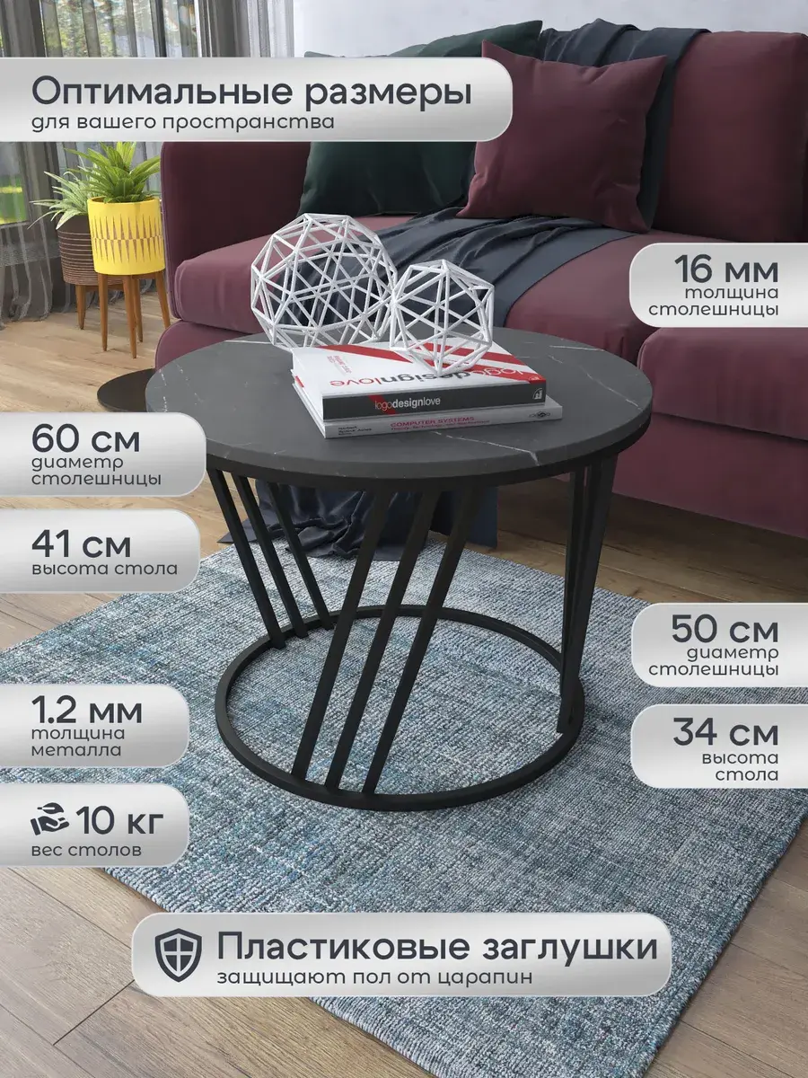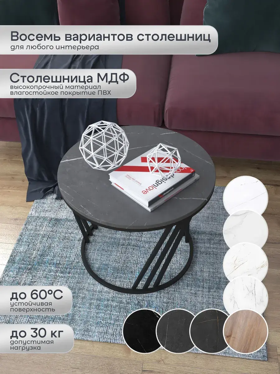 Журнальный стол "Адидас" — это стильное и функциональное дополнение к вашему интерьеру. Его уникальный дизайн и высокое качество сразу привлекают внимание. Столешница влагостойкая, а основание покрыто прочной полимерно-порошковой краской. Благодаря этому он не только привлекательно выглядит, но и очень практичен. Конструкция столика надёжна, он выдерживает нагрузку на столешницу до 30 кг. Это позволяет разместить на нём различные предметы декора или напитки. Цвет основания: черный, столешницы: мрамор черный матовый. Основание выполнено из квадратной профильной трубы 15х15 толщиной 1.2мм Этот журнальный столик удобен в использовании. Он не царапает пол и не шатается, обеспечивая дополнительный комфорт при эксплуатации. Производство в России гарантирует высокое качество товара и его соответствие всем стандартам. Кроме того, столик поставляется уже собранным. Вам не придётся тратить время и силы на его сборку. Просто распакуйте его и наслаждайтесь преимуществами этого прекрасного изделия. Круглый журнальный столик со столешницей под мрамор — это не просто мебель. Это настоящее произведение искусства, которое подчеркнёт ваш вкус и станет главным акцентом в вашем доме. Покупая этот столик, вы получаете не только функциональную мебель, но и предмет декора, который добавит шарма и уюта в ваше пространство. Не упустите возможность купить этот уникальный журнальный столик и создать уютный уголок в вашем доме, который будет радовать вас каждый день.