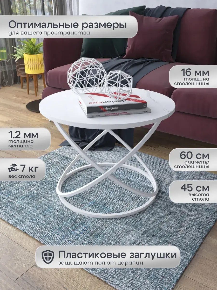Журнальный стол "Инфинити" — это стильное и функциональное дополнение к вашему интерьеру. Его уникальный дизайн и высокое качество сразу привлекают внимание. Столешница влагостойкая, а основание покрыто прочной полимерно-порошковой краской. Благодаря этому он не только привлекательно выглядит, но и очень практичен. Конструкция столика надёжна, он выдерживает нагрузку на столешницу до 30 кг. Это позволяет разместить на нём различные предметы декора или напитки. Цвет основания: белый, столешницы: мрамор белый матовый. Основание выполнено из квадратной профильной трубы 15х15 толщиной 1.2мм Этот журнальный столик удобен в использовании. Он не царапает пол и не шатается, обеспечивая дополнительный комфорт при эксплуатации. Производство в России гарантирует высокое качество товара и его соответствие всем стандартам. Кроме того, столик поставляется уже собранным. Вам не придётся тратить время и силы на его сборку. Просто распакуйте его и наслаждайтесь преимуществами этого прекрасного изделия. Круглый журнальный столик со столешницей под мрамор — это не просто мебель. Это настоящее произведение искусства, которое подчеркнёт ваш вкус и станет главным акцентом в вашем доме. Покупая этот столик, вы получаете не только функциональную мебель, но и предмет декора, который добавит шарма и уюта в ваше пространство. Не упустите возможность купить этот уникальный журнальный столик и создать уютный уголок в вашем доме, который будет радовать вас каждый день.