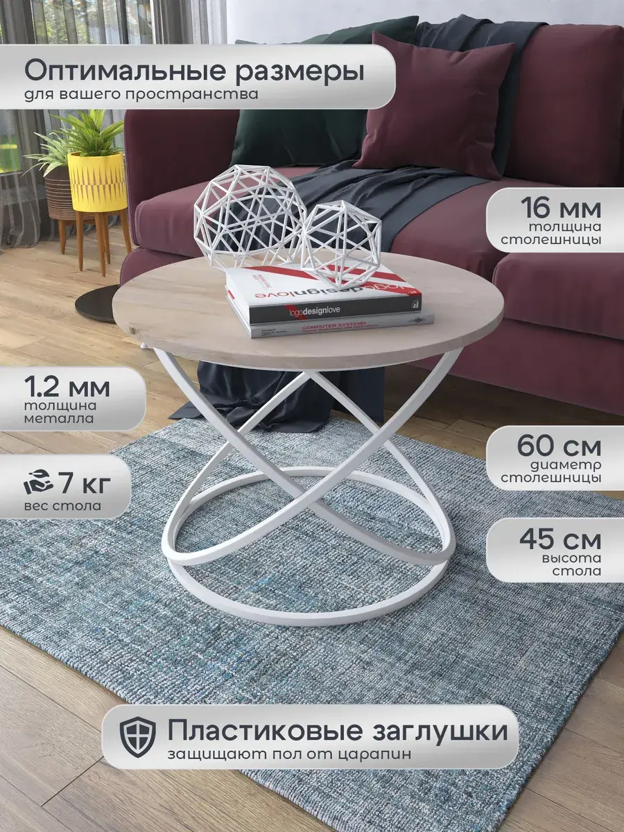 Журнальный стол "Инфинити" — это стильное и функциональное дополнение к вашему интерьеру. Его уникальный дизайн и высокое качество сразу привлекают внимание. Столешница влагостойкая, а основание покрыто прочной полимерно-порошковой краской. Благодаря этому он не только привлекательно выглядит, но и очень практичен. Конструкция столика надёжна, он выдерживает нагрузку на столешницу до 30 кг. Это позволяет разместить на нём различные предметы декора или напитки. Цвет основания: белый, столешницы: дуб натуральный. Основание выполнено из квадратной профильной трубы 15х15 толщиной 1.2мм Этот журнальный столик удобен в использовании. Он не царапает пол и не шатается, обеспечивая дополнительный комфорт при эксплуатации. Производство в России гарантирует высокое качество товара и его соответствие всем стандартам. Кроме того, столик поставляется уже собранным. Вам не придётся тратить время и силы на его сборку. Просто распакуйте его и наслаждайтесь преимуществами этого прекрасного изделия. Круглый журнальный столик со столешницей под мрамор — это не просто мебель. Это настоящее произведение искусства, которое подчеркнёт ваш вкус и станет главным акцентом в вашем доме. Покупая этот столик, вы получаете не только функциональную мебель, но и предмет декора, который добавит шарма и уюта в ваше пространство. Не упустите возможность купить этот уникальный журнальный столик и создать уютный уголок в вашем доме, который будет радовать вас каждый день.