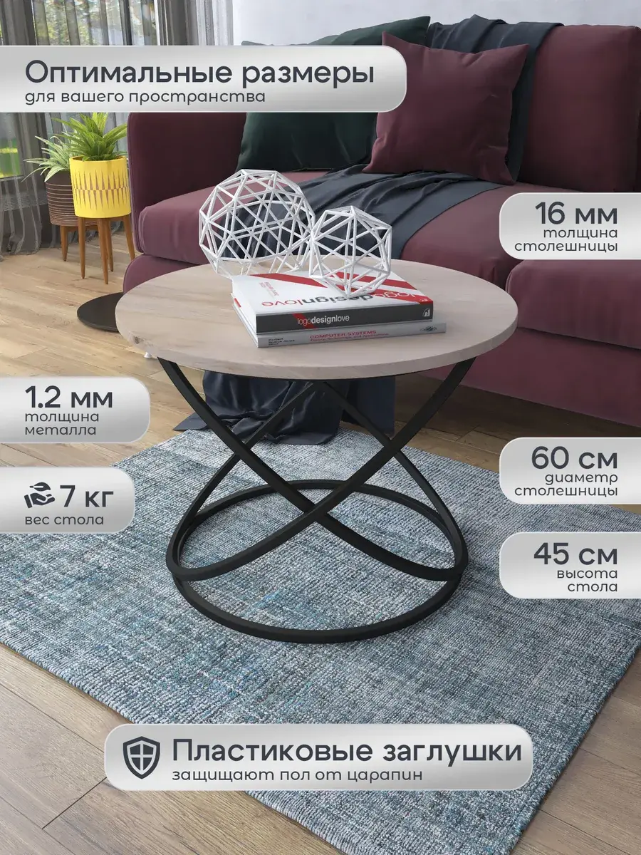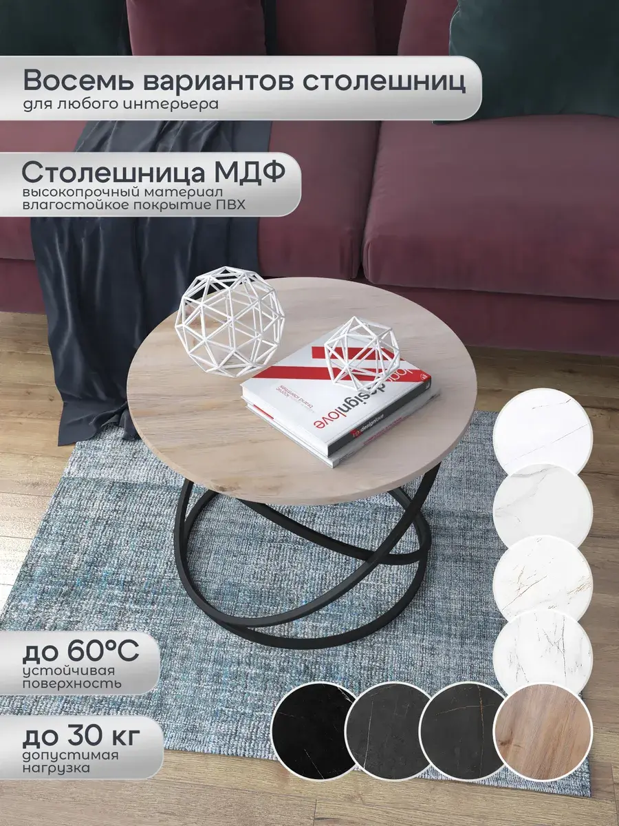 Журнальный стол "Инфинити" — это стильное и функциональное дополнение к вашему интерьеру. Его уникальный дизайн и высокое качество сразу привлекают внимание. Столешница влагостойкая, а основание покрыто прочной полимерно-порошковой краской. Благодаря этому он не только привлекательно выглядит, но и очень практичен. Конструкция столика надёжна, он выдерживает нагрузку на столешницу до 30 кг. Это позволяет разместить на нём различные предметы декора или напитки. Цвет основания: черный, столешницы: дуб натуральный. Основание выполнено из квадратной профильной трубы 15х15 толщиной 1.2мм Этот журнальный столик удобен в использовании. Он не царапает пол и не шатается, обеспечивая дополнительный комфорт при эксплуатации. Производство в России гарантирует высокое качество товара и его соответствие всем стандартам. Кроме того, столик поставляется уже собранным. Вам не придётся тратить время и силы на его сборку. Просто распакуйте его и наслаждайтесь преимуществами этого прекрасного изделия. Круглый журнальный столик со столешницей под мрамор — это не просто мебель. Это настоящее произведение искусства, которое подчеркнёт ваш вкус и станет главным акцентом в вашем доме. Покупая этот столик, вы получаете не только функциональную мебель, но и предмет декора, который добавит шарма и уюта в ваше пространство. Не упустите возможность купить этот уникальный журнальный столик и создать уютный уголок в вашем доме, который будет радовать вас каждый день.