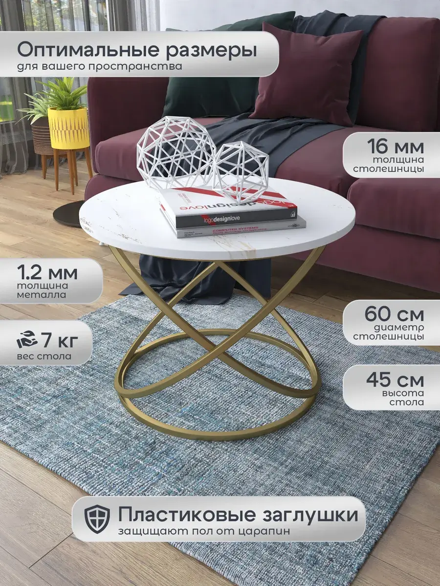 Журнальный стол "Инфинити" — это стильное и функциональное дополнение к вашему интерьеру. Его уникальный дизайн и высокое качество сразу привлекают внимание. Столешница влагостойкая, а основание покрыто прочной полимерно-порошковой краской. Благодаря этому он не только привлекательно выглядит, но и очень практичен. Конструкция столика надёжна, он выдерживает нагрузку на столешницу до 30 кг. Это позволяет разместить на нём различные предметы декора или напитки. Цвет основания: золото, столешницы: мрамор золото белый матовый. Основание выполнено из квадратной профильной трубы 15х15 толщиной 1.2мм Этот журнальный столик удобен в использовании. Он не царапает пол и не шатается, обеспечивая дополнительный комфорт при эксплуатации. Производство в России гарантирует высокое качество товара и его соответствие всем стандартам. Кроме того, столик поставляется уже собранным. Вам не придётся тратить время и силы на его сборку. Просто распакуйте его и наслаждайтесь преимуществами этого прекрасного изделия. Круглый журнальный столик со столешницей под мрамор — это не просто мебель. Это настоящее произведение искусства, которое подчеркнёт ваш вкус и станет главным акцентом в вашем доме. Покупая этот столик, вы получаете не только функциональную мебель, но и предмет декора, который добавит шарма и уюта в ваше пространство. Не упустите возможность купить этот уникальный журнальный столик и создать уютный уголок в вашем доме, который будет радовать вас каждый день.