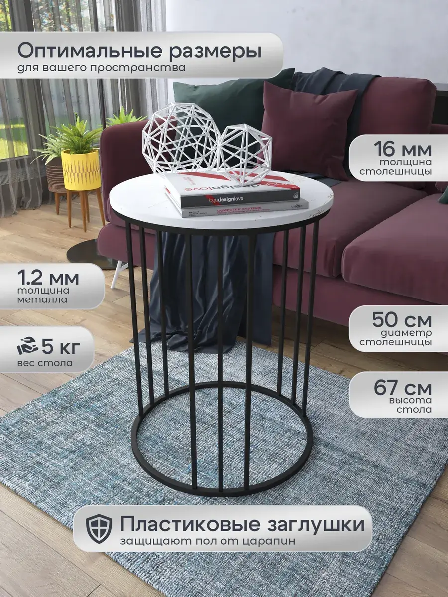 Журнальный стол "Трио" — это стильное и функциональное дополнение к вашему интерьеру. Его уникальный дизайн и высокое качество сразу привлекают внимание. Столешница влагостойкая, а основание покрыто прочной полимерно-порошковой краской. Благодаря этому он не только привлекательно выглядит, но и очень практичен. Конструкция столика надёжна, он выдерживает нагрузку на столешницу до 30 кг. Это позволяет разместить на нём различные предметы декора или напитки. Цвет основания: черный, столешницы: мрамор золото белый матовый. Основание выполнено из квадратной профильной трубы 15х15 толщиной 1.2мм Этот журнальный столик удобен в использовании. Он не царапает пол и не шатается, обеспечивая дополнительный комфорт при эксплуатации. Производство в России гарантирует высокое качество товара и его соответствие всем стандартам. Кроме того, столик поставляется уже собранным. Вам не придётся тратить время и силы на его сборку. Просто распакуйте его и наслаждайтесь преимуществами этого прекрасного изделия. Круглый журнальный столик со столешницей под мрамор — это не просто мебель. Это настоящее произведение искусства, которое подчеркнёт ваш вкус и станет главным акцентом в вашем доме. Покупая этот столик, вы получаете не только функциональную мебель, но и предмет декора, который добавит шарма и уюта в ваше пространство. Не упустите возможность купить этот уникальный журнальный столик и создать уютный уголок в вашем доме, который будет радовать вас каждый день.