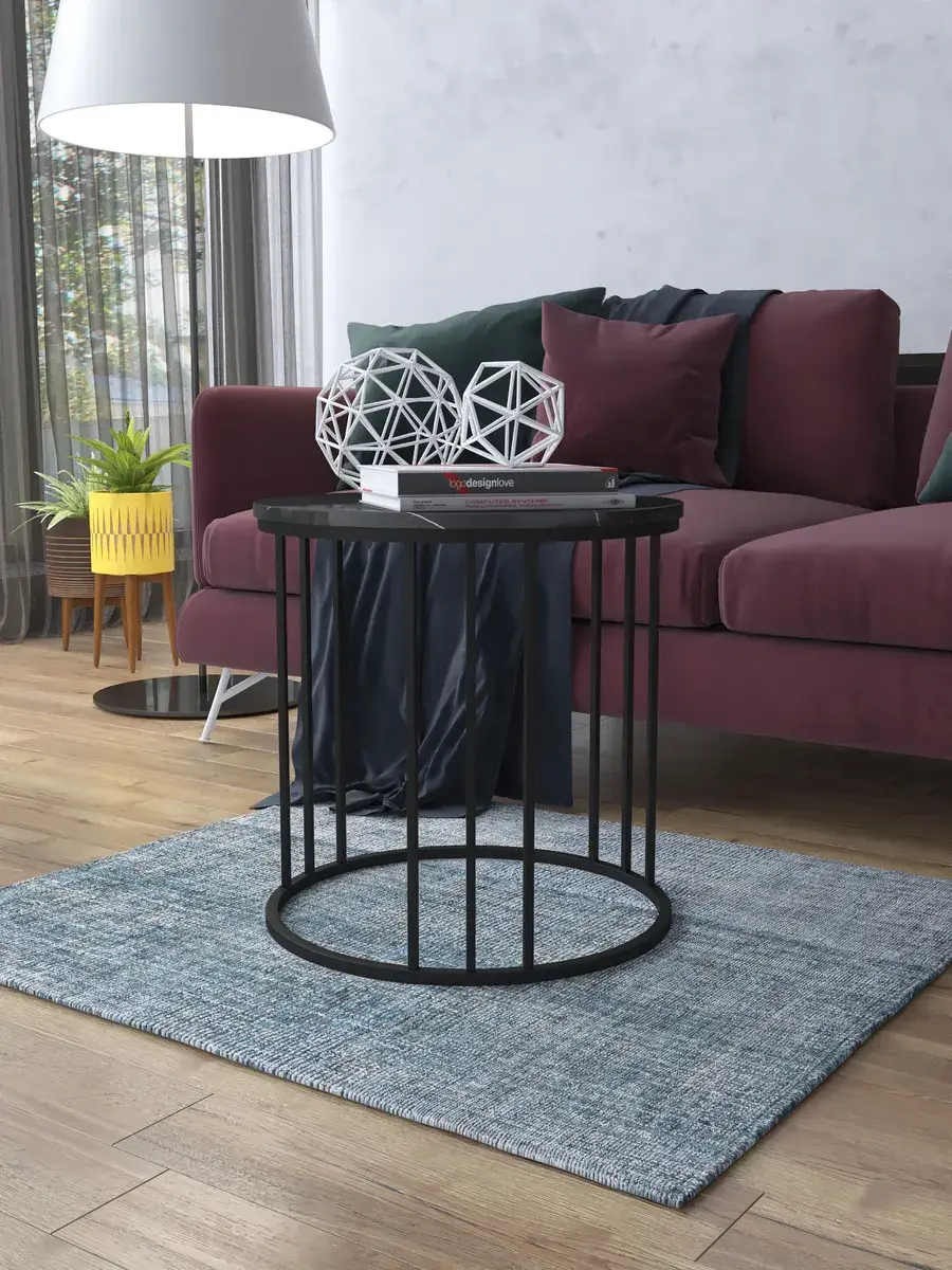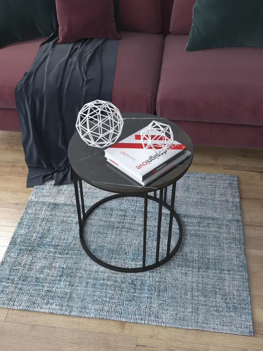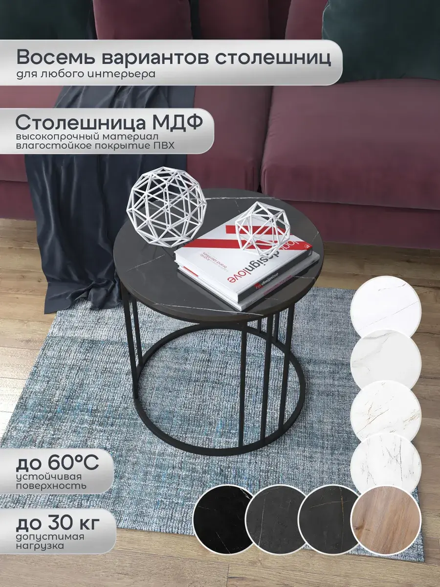 Журнальный стол "Трио малый" — это стильное и функциональное дополнение к вашему интерьеру. Его уникальный дизайн и высокое качество сразу привлекают внимание. Столешница влагостойкая, а основание покрыто прочной полимерно-порошковой краской. Благодаря этому он не только привлекательно выглядит, но и очень практичен. Конструкция столика надёжна, он выдерживает нагрузку на столешницу до 30 кг. Это позволяет разместить на нём различные предметы декора или напитки. Цвет основания: черный, столешницы: мрамор черный глянцевый. Основание выполнено из квадратной профильной трубы 15х15 толщиной 1.2мм Этот журнальный столик удобен в использовании. Он не царапает пол и не шатается, обеспечивая дополнительный комфорт при эксплуатации. Производство в России гарантирует высокое качество товара и его соответствие всем стандартам. Кроме того, столик поставляется уже собранным. Вам не придётся тратить время и силы на его сборку. Просто распакуйте его и наслаждайтесь преимуществами этого прекрасного изделия. Круглый журнальный столик со столешницей под мрамор — это не просто мебель. Это настоящее произведение искусства, которое подчеркнёт ваш вкус и станет главным акцентом в вашем доме. Покупая этот столик, вы получаете не только функциональную мебель, но и предмет декора, который добавит шарма и уюта в ваше пространство. Не упустите возможность купить этот уникальный журнальный столик и создать уютный уголок в вашем доме, который будет радовать вас каждый день.