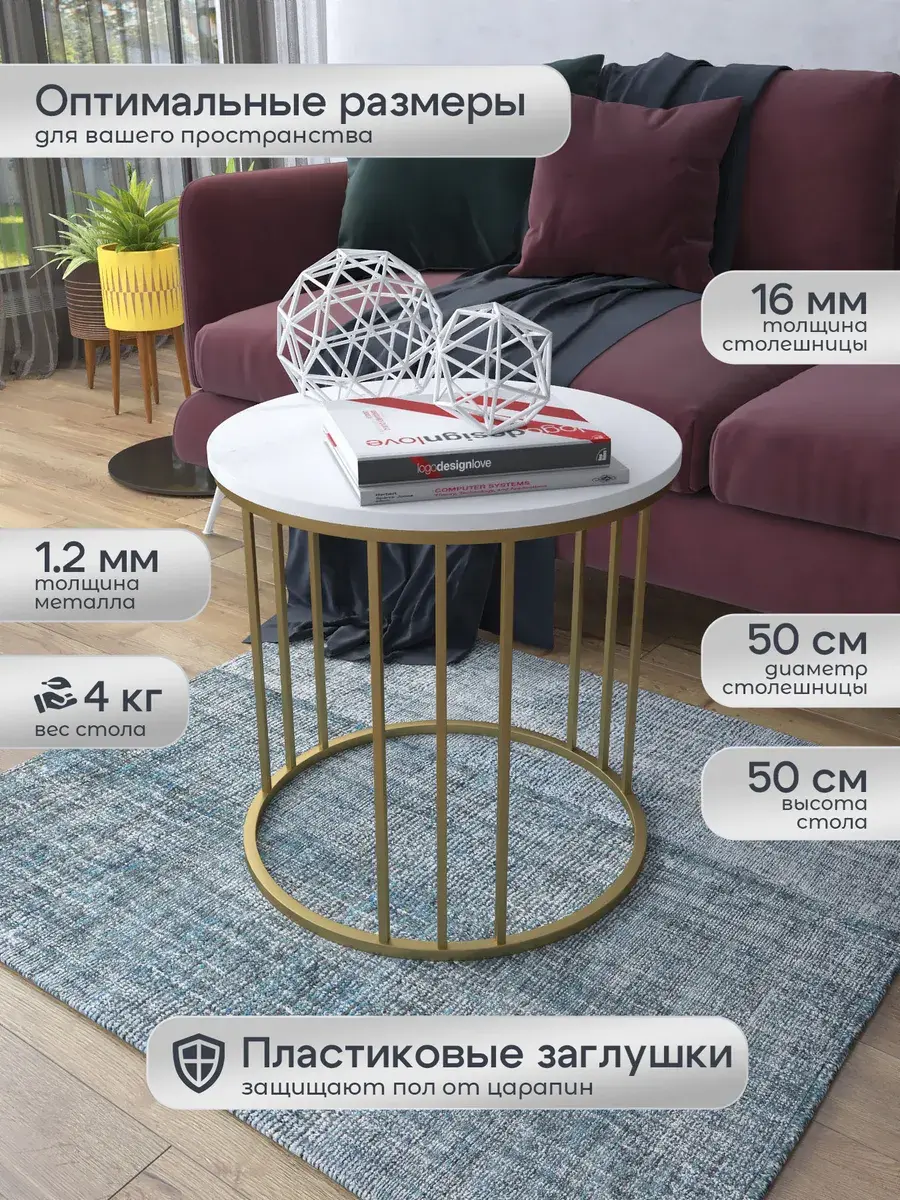 Журнальный стол "Трио малый" — это стильное и функциональное дополнение к вашему интерьеру. Его уникальный дизайн и высокое качество сразу привлекают внимание. Столешница влагостойкая, а основание покрыто прочной полимерно-порошковой краской. Благодаря этому он не только привлекательно выглядит, но и очень практичен. Конструкция столика надёжна, он выдерживает нагрузку на столешницу до 30 кг. Это позволяет разместить на нём различные предметы декора или напитки. Цвет основания: золото, столешницы: мрамор белый матовый. Основание выполнено из квадратной профильной трубы 15х15 толщиной 1.2мм Этот журнальный столик удобен в использовании. Он не царапает пол и не шатается, обеспечивая дополнительный комфорт при эксплуатации. Производство в России гарантирует высокое качество товара и его соответствие всем стандартам. Кроме того, столик поставляется уже собранным. Вам не придётся тратить время и силы на его сборку. Просто распакуйте его и наслаждайтесь преимуществами этого прекрасного изделия. Круглый журнальный столик со столешницей под мрамор — это не просто мебель. Это настоящее произведение искусства, которое подчеркнёт ваш вкус и станет главным акцентом в вашем доме. Покупая этот столик, вы получаете не только функциональную мебель, но и предмет декора, который добавит шарма и уюта в ваше пространство. Не упустите возможность купить этот уникальный журнальный столик и создать уютный уголок в вашем доме, который будет радовать вас каждый день.