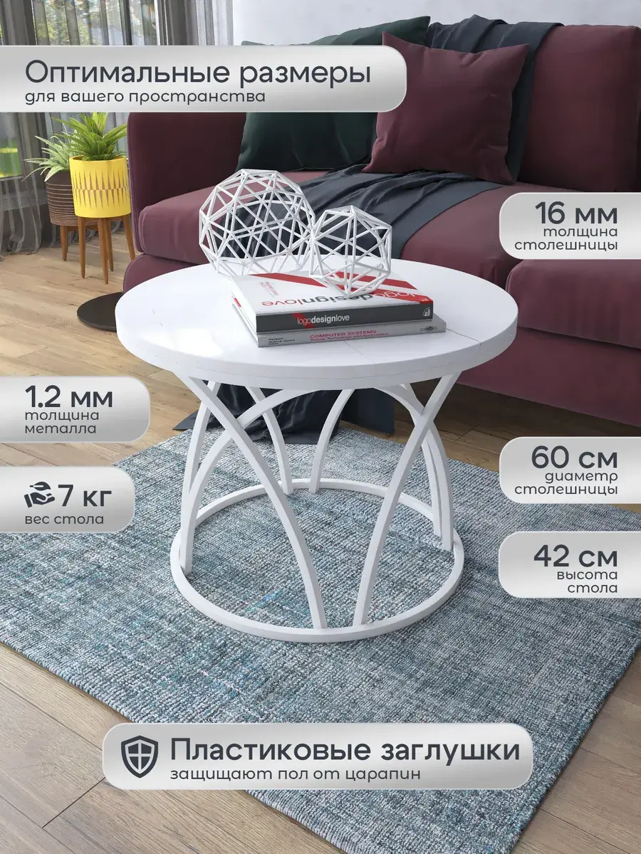 Журнальный стол "Тюльпан" — это стильное и функциональное дополнение к вашему интерьеру. Его уникальный дизайн и высокое качество сразу привлекают внимание. Столешница влагостойкая, а основание покрыто прочной полимерно-порошковой краской. Благодаря этому он не только привлекательно выглядит, но и очень практичен. Конструкция столика надёжна, он выдерживает нагрузку на столешницу до 30 кг. Это позволяет разместить на нём различные предметы декора или напитки. Цвет основания: белый, столешницы: мрамор белый глянцевый. Основание выполнено из квадратной профильной трубы 15х15 толщиной 1.2мм Этот журнальный столик удобен в использовании. Он не царапает пол и не шатается, обеспечивая дополнительный комфорт при эксплуатации. Производство в России гарантирует высокое качество товара и его соответствие всем стандартам. Кроме того, столик поставляется уже собранным. Вам не придётся тратить время и силы на его сборку. Просто распакуйте его и наслаждайтесь преимуществами этого прекрасного изделия. Круглый журнальный столик со столешницей под мрамор — это не просто мебель. Это настоящее произведение искусства, которое подчеркнёт ваш вкус и станет главным акцентом в вашем доме. Покупая этот столик, вы получаете не только функциональную мебель, но и предмет декора, который добавит шарма и уюта в ваше пространство. Не упустите возможность купить этот уникальный журнальный столик и создать уютный уголок в вашем доме, который будет радовать вас каждый день.