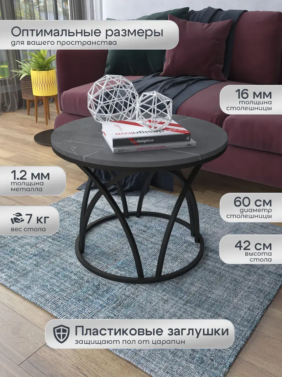 Журнальный стол "Тюльпан" — это стильное и функциональное дополнение к вашему интерьеру. Его уникальный дизайн и высокое качество сразу привлекают внимание. Столешница влагостойкая, а основание покрыто прочной полимерно-порошковой краской. Благодаря этому он не только привлекательно выглядит, но и очень практичен. Конструкция столика надёжна, он выдерживает нагрузку на столешницу до 30 кг. Это позволяет разместить на нём различные предметы декора или напитки. Цвет основания: черный, столешницы: мрамор серебро черный матовый. Основание выполнено из квадратной профильной трубы 15х15 толщиной 1.2мм Этот журнальный столик удобен в использовании. Он не царапает пол и не шатается, обеспечивая дополнительный комфорт при эксплуатации. Производство в России гарантирует высокое качество товара и его соответствие всем стандартам. Кроме того, столик поставляется уже собранным. Вам не придётся тратить время и силы на его сборку. Просто распакуйте его и наслаждайтесь преимуществами этого прекрасного изделия. Круглый журнальный столик со столешницей под мрамор — это не просто мебель. Это настоящее произведение искусства, которое подчеркнёт ваш вкус и станет главным акцентом в вашем доме. Покупая этот столик, вы получаете не только функциональную мебель, но и предмет декора, который добавит шарма и уюта в ваше пространство. Не упустите возможность купить этот уникальный журнальный столик и создать уютный уголок в вашем доме, который будет радовать вас каждый день.