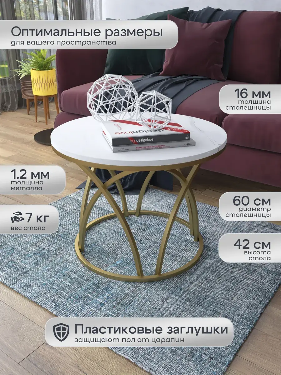 Журнальный стол "Тюльпан" — это стильное и функциональное дополнение к вашему интерьеру. Его уникальный дизайн и высокое качество сразу привлекают внимание. Столешница влагостойкая, а основание покрыто прочной полимерно-порошковой краской. Благодаря этому он не только привлекательно выглядит, но и очень практичен. Конструкция столика надёжна, он выдерживает нагрузку на столешницу до 30 кг. Это позволяет разместить на нём различные предметы декора или напитки. Цвет основания: золото, столешницы: мрамор белый матовый. Основание выполнено из квадратной профильной трубы 15х15 толщиной 1.2мм Этот журнальный столик удобен в использовании. Он не царапает пол и не шатается, обеспечивая дополнительный комфорт при эксплуатации. Производство в России гарантирует высокое качество товара и его соответствие всем стандартам. Кроме того, столик поставляется уже собранным. Вам не придётся тратить время и силы на его сборку. Просто распакуйте его и наслаждайтесь преимуществами этого прекрасного изделия. Круглый журнальный столик со столешницей под мрамор — это не просто мебель. Это настоящее произведение искусства, которое подчеркнёт ваш вкус и станет главным акцентом в вашем доме. Покупая этот столик, вы получаете не только функциональную мебель, но и предмет декора, который добавит шарма и уюта в ваше пространство. Не упустите возможность купить этот уникальный журнальный столик и создать уютный уголок в вашем доме, который будет радовать вас каждый день.
