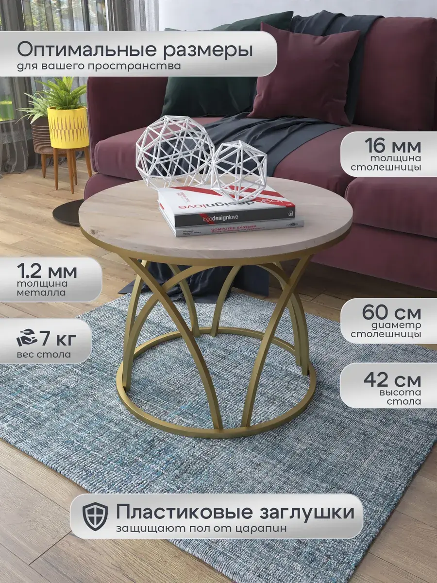 Журнальный стол "Тюльпан" — это стильное и функциональное дополнение к вашему интерьеру. Его уникальный дизайн и высокое качество сразу привлекают внимание. Столешница влагостойкая, а основание покрыто прочной полимерно-порошковой краской. Благодаря этому он не только привлекательно выглядит, но и очень практичен. Конструкция столика надёжна, он выдерживает нагрузку на столешницу до 30 кг. Это позволяет разместить на нём различные предметы декора или напитки. Цвет основания: золото, столешницы: дуб натуральный. Основание выполнено из квадратной профильной трубы 15х15 толщиной 1.2мм Этот журнальный столик удобен в использовании. Он не царапает пол и не шатается, обеспечивая дополнительный комфорт при эксплуатации. Производство в России гарантирует высокое качество товара и его соответствие всем стандартам. Кроме того, столик поставляется уже собранным. Вам не придётся тратить время и силы на его сборку. Просто распакуйте его и наслаждайтесь преимуществами этого прекрасного изделия. Круглый журнальный столик со столешницей под мрамор — это не просто мебель. Это настоящее произведение искусства, которое подчеркнёт ваш вкус и станет главным акцентом в вашем доме. Покупая этот столик, вы получаете не только функциональную мебель, но и предмет декора, который добавит шарма и уюта в ваше пространство. Не упустите возможность купить этот уникальный журнальный столик и создать уютный уголок в вашем доме, который будет радовать вас каждый день.