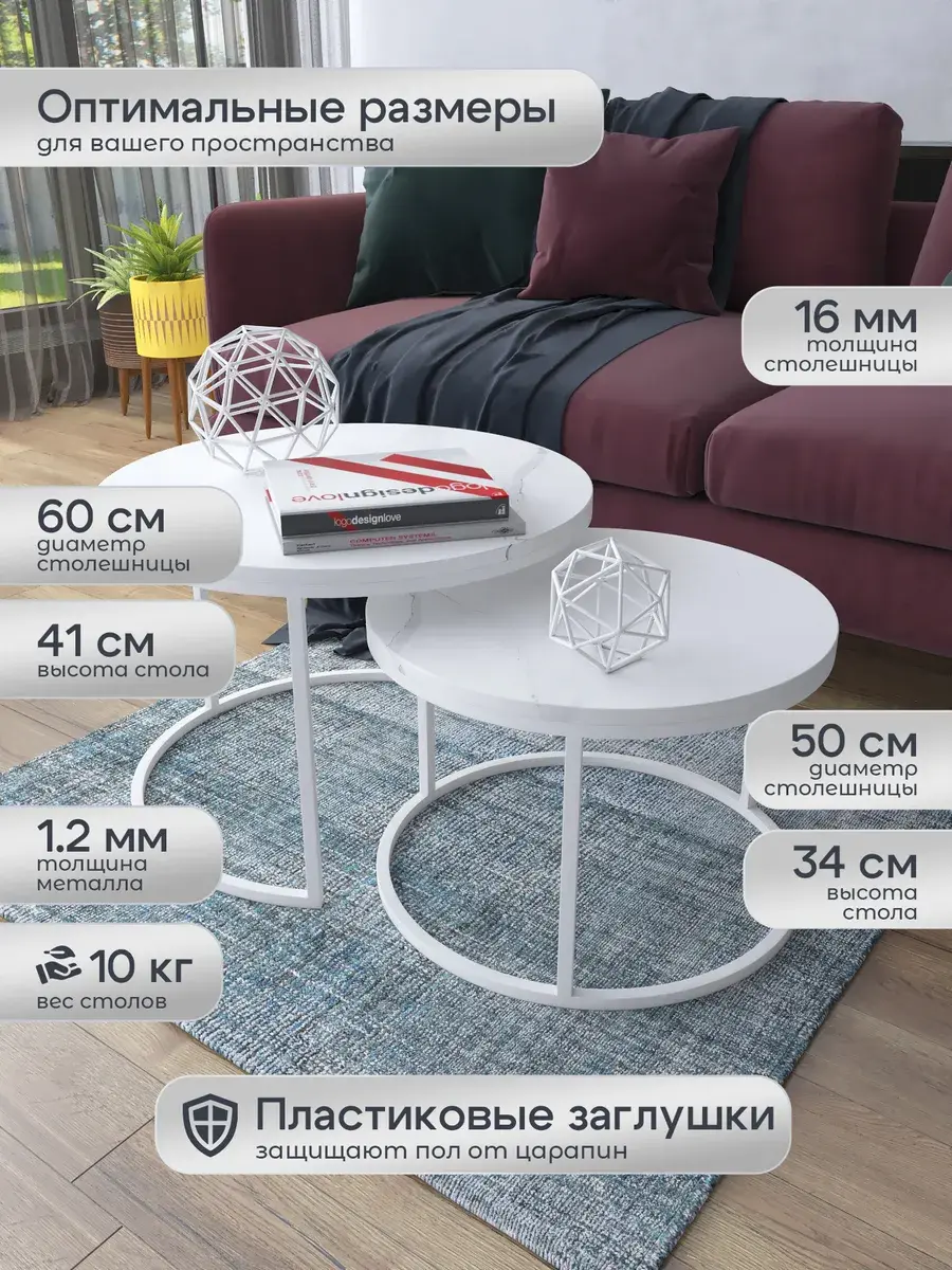 Пара журнальных столов "Акцент" — это стильное и функциональное дополнение к вашему интерьеру. Его уникальный дизайн и высокое качество сразу привлекают внимание. Столешницы влагостойкие, а основания покрыты прочной полимерно-порошковой краской. Благодаря этому они не только привлекательно выглядят, но и очень практичны. Конструкция столиков надёжна, они выдерживают нагрузку на столешницу до 30 кг. Это позволяет разместить на них различные предметы декора или напитки. Высота большего стола 41см, диаметр - 60см; высота малого столика - 34см, диаметр - 50см. Цвет основания: белый, столешницы: мрамор белый матовый. Основание выполнено из квадратной профильной трубы 15х15 толщиной 1.2мм Эти журнальные столики удобны в использовании. Они не царапают пол и не шатаются, обеспечивая дополнительный комфорт при эксплуатации. Производство в России гарантирует высокое качество товара и его соответствие всем стандартам. Кроме того, столики поставляются уже собранными. Вам не придётся тратить время и силы на их сборку. Просто распакуйте и наслаждайтесь преимуществами этих прекрасных изделий. Круглые журнальные столики со столешницей под мрамор — это не просто мебель. Это настоящее произведение искусства, которое подчеркнёт ваш вкус и станет главным акцентом в вашем доме. Покупая эти столики, вы получаете не только функциональную мебель, но и предмет декора, который добавит шарма и уюта в ваше пространство. Не упустите возможность купить эти уникальные журнальные столики и создать уютный уголок в вашем доме,на радость каждый день.