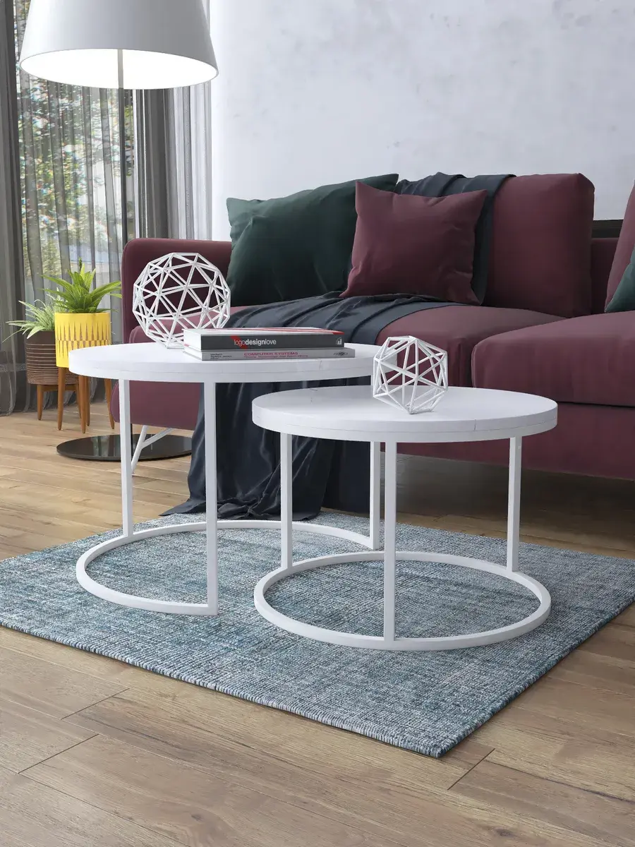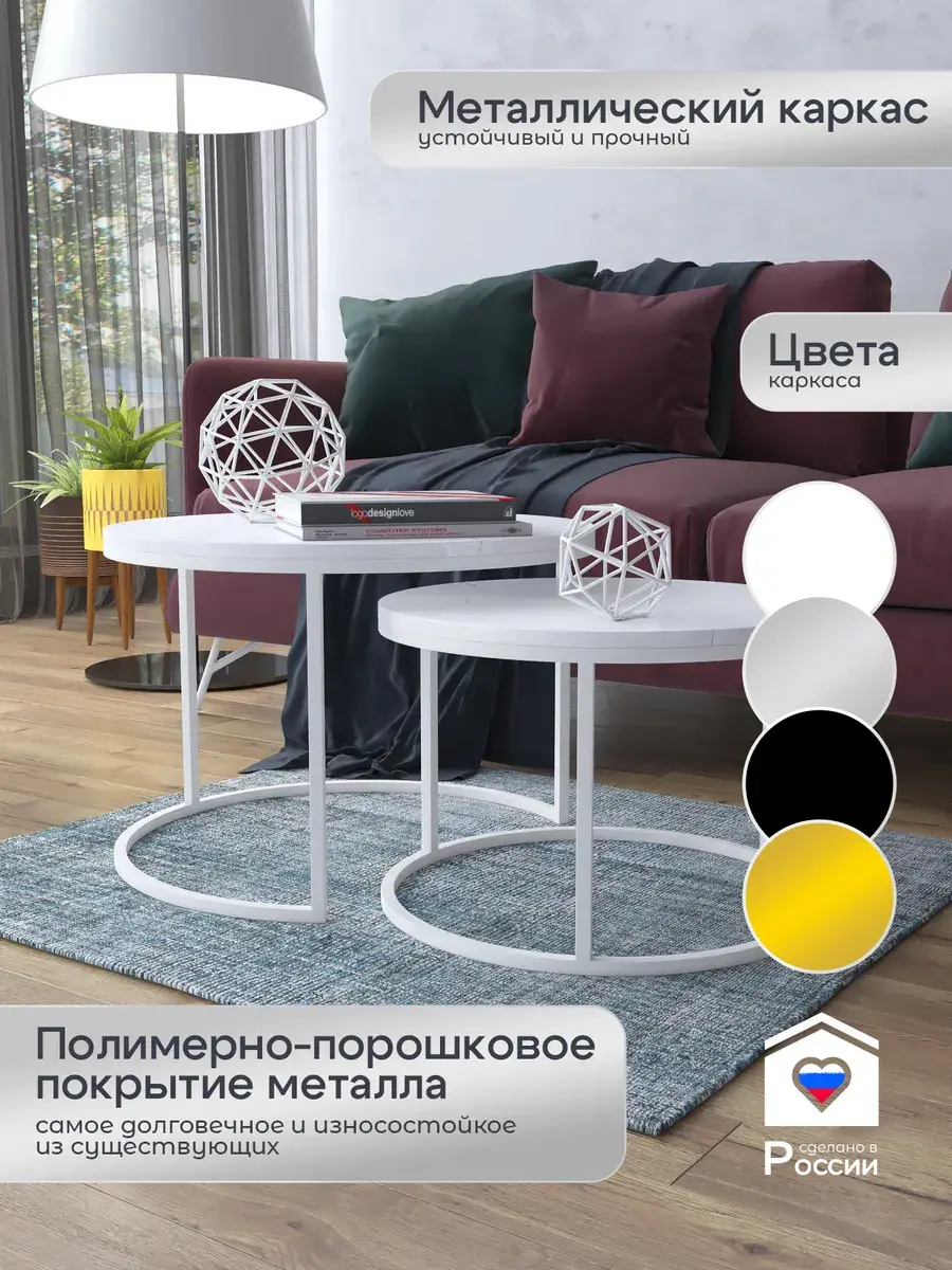 Пара журнальных столов "Акцент" — это стильное и функциональное дополнение к вашему интерьеру. Его уникальный дизайн и высокое качество сразу привлекают внимание. Столешницы влагостойкие, а основания покрыты прочной полимерно-порошковой краской. Благодаря этому они не только привлекательно выглядят, но и очень практичны. Конструкция столиков надёжна, они выдерживают нагрузку на столешницу до 30 кг. Это позволяет разместить на них различные предметы декора или напитки. Высота большего стола 41см, диаметр - 60см; высота малого столика - 34см, диаметр - 50см. Цвет основания: белый, столешницы: мрамор белый глянцевый. Основание выполнено из квадратной профильной трубы 15х15 толщиной 1.2мм Эти журнальные столики удобны в использовании. Они не царапают пол и не шатаются, обеспечивая дополнительный комфорт при эксплуатации. Производство в России гарантирует высокое качество товара и его соответствие всем стандартам. Кроме того, столики поставляются уже собранными. Вам не придётся тратить время и силы на их сборку. Просто распакуйте и наслаждайтесь преимуществами этих прекрасных изделий. Круглые журнальные столики со столешницей под мрамор — это не просто мебель. Это настоящее произведение искусства, которое подчеркнёт ваш вкус и станет главным акцентом в вашем доме. Покупая эти столики, вы получаете не только функциональную мебель, но и предмет декора, который добавит шарма и уюта в ваше пространство. Не упустите возможность купить эти уникальные журнальные столики и создать уютный уголок в вашем доме,на радость каждый день.