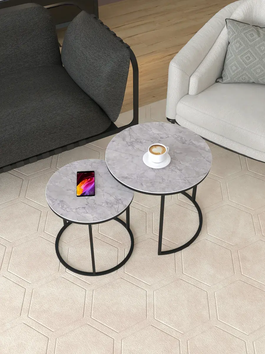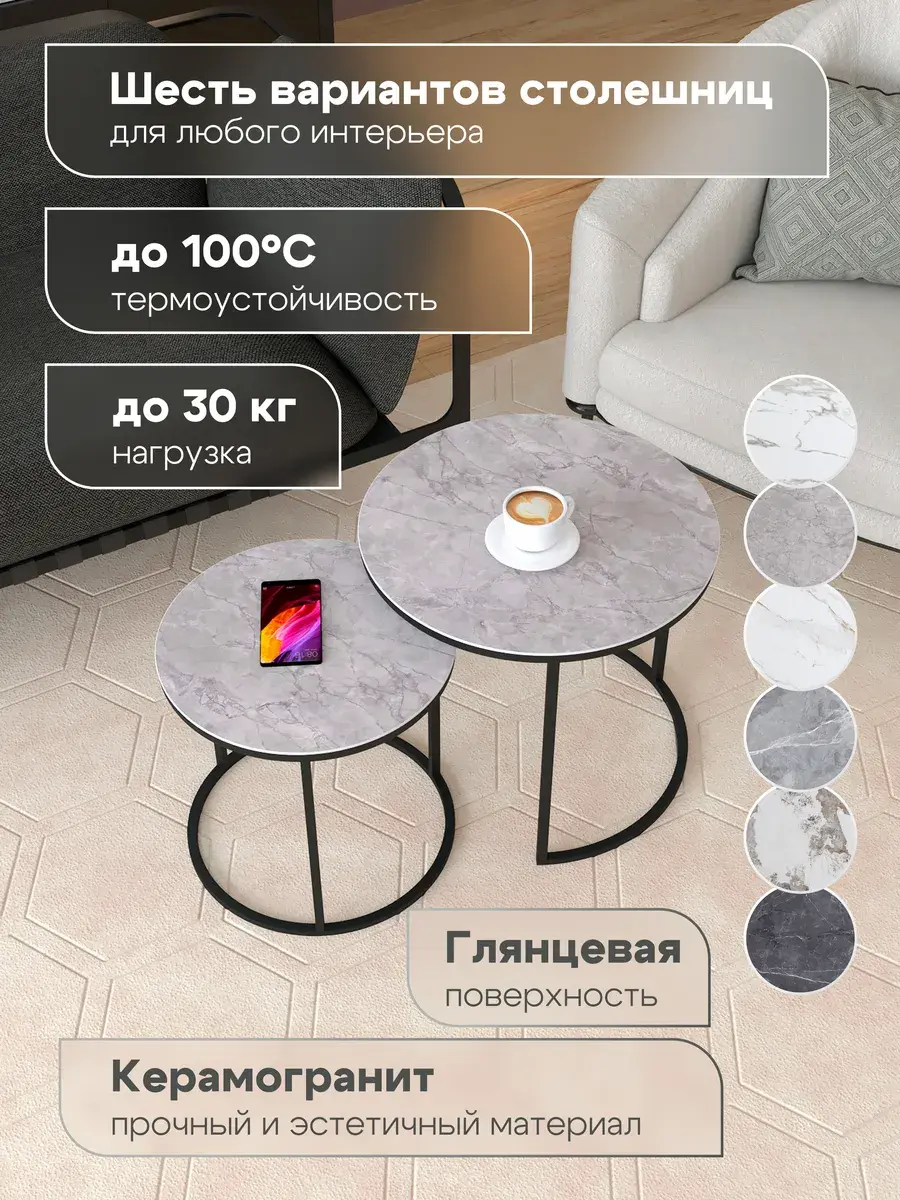 Превратите свою гостиную в стильное пространство с этим элегантным круглый журнальный столик. Этот стильный комплект включает два стола: большой диаметром 50 см и высотой 45 см, а также малый диаметром 40 см и высотой 40 см. Универсальный приставной столик станет идеальным дополнением к любому дивану или креслу. Благородный керамогранит столешницы создает ощущение роскоши. Журнальный столик круглый выполнен в лучших традициях современного дизайна. Стол журнальный выполнен в лучших традициях современного дизайна. Вы можете выбрать из 24 вариантов цветовых решений, что позволит идеально вписать столики в ваш интерьер. Не упустите возможность приобрести этот шедевр дизайна уже сегодня!