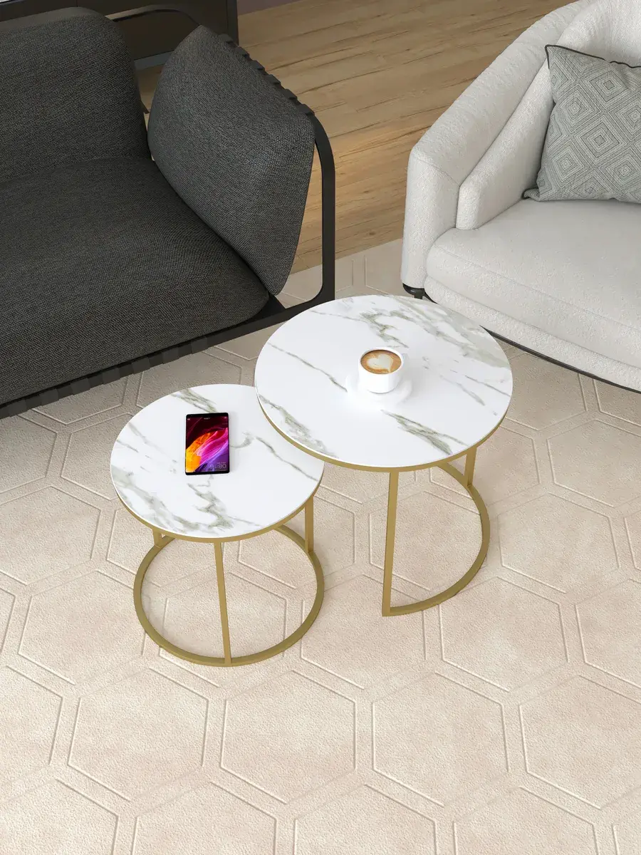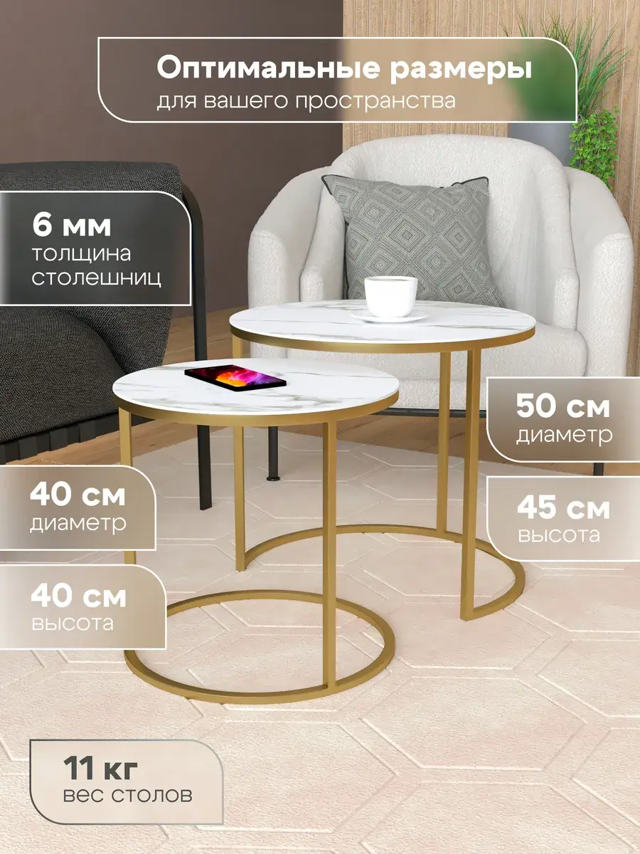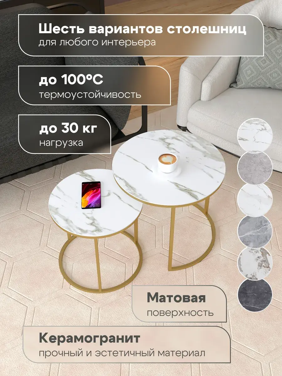 Воплотите атмосферу современности и уюта благодаря этому прекрасному круглый журнальный столик. Этот стильный комплект включает два стола: большой диаметром 50 см и высотой 45 см, а также малый диаметром 40 см и высотой 40 см. Этот журнальный столик круглый может использоваться как столик прикроватный, добавляя функциональность в спальню. Изысканная керамогранитная поверхность поражает своей красотой. Приставной столик выполнен в лучших традициях современного дизайна. Стол журнальный выполнен в лучших традициях современного дизайна. Вы можете выбрать из 24 вариантов цветовых решений, что позволит идеально вписать столики в ваш интерьер. Порадуйте себя покупкой, которая изменит ваш дом к лучшему!
