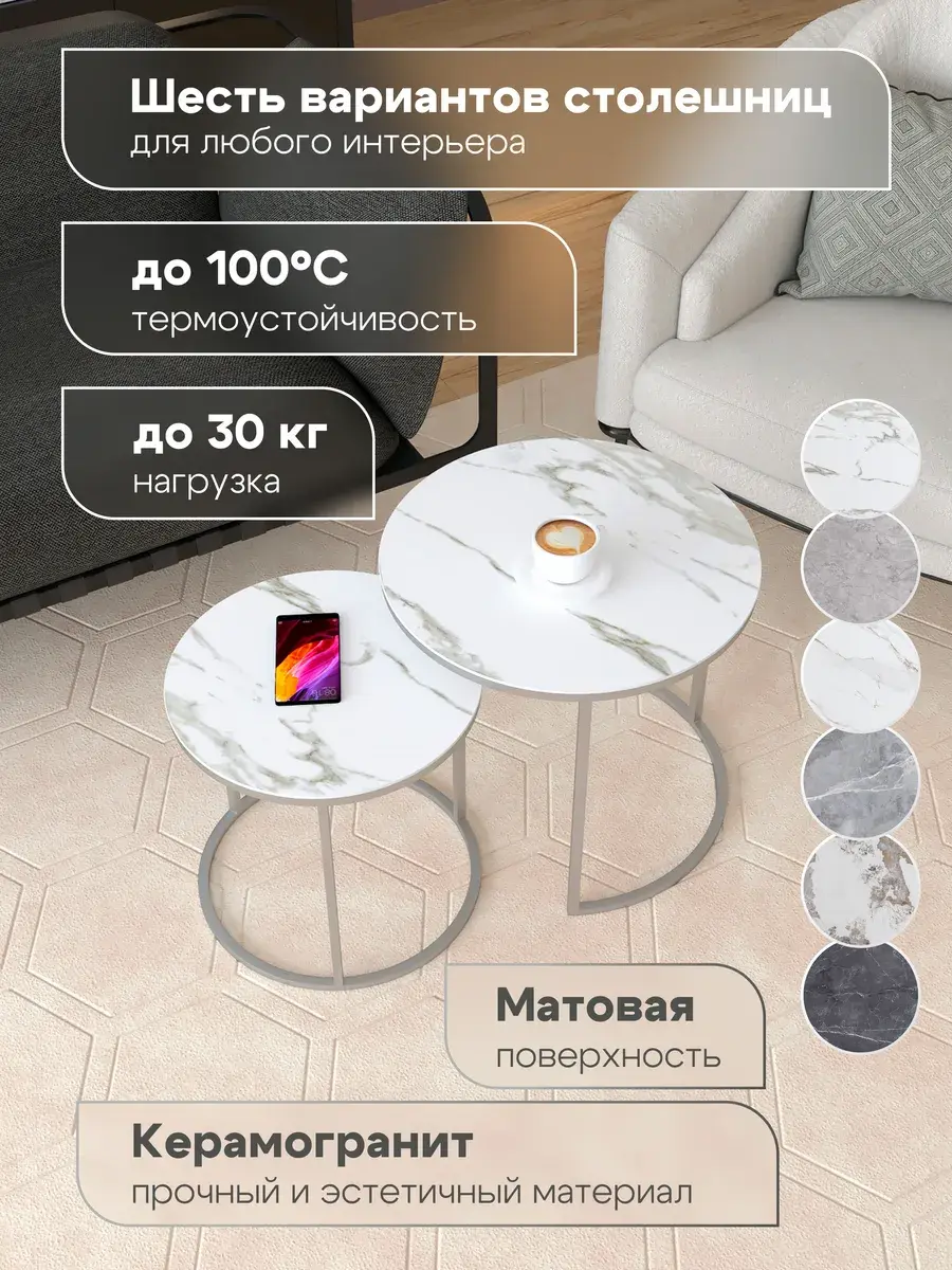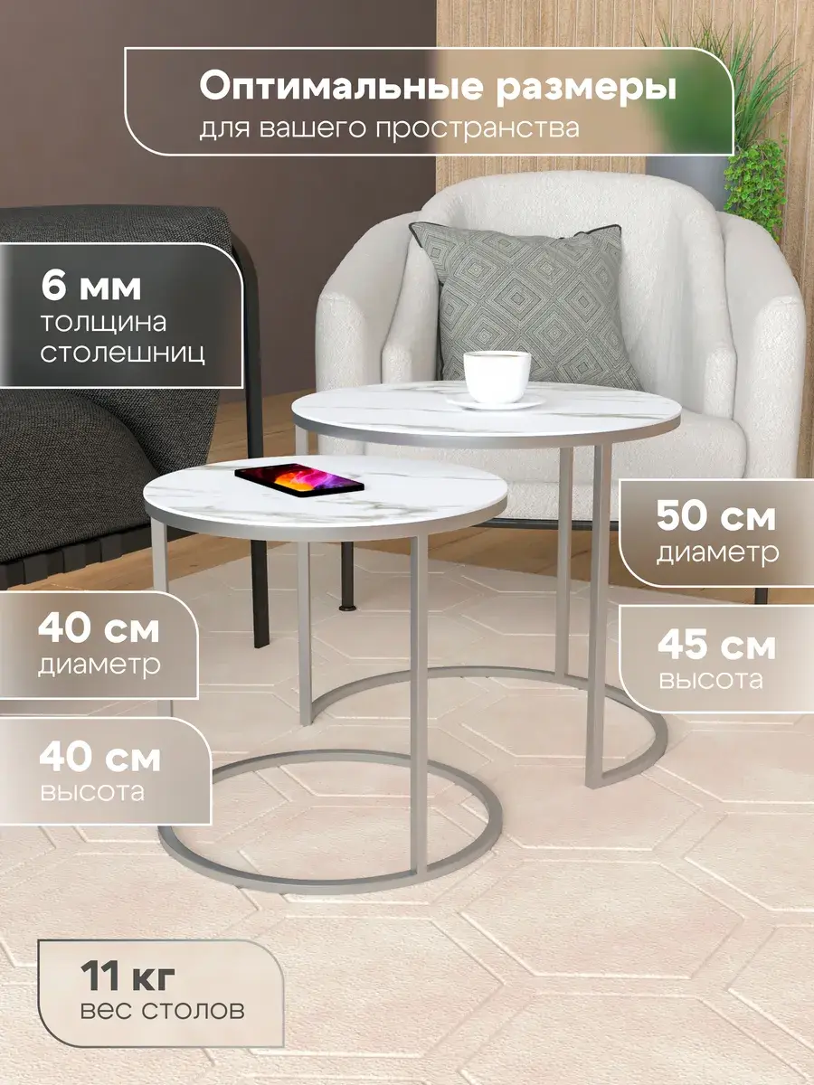 - Комплектация стол большой D50x45, стол малый D40x40, упаковка, коробка