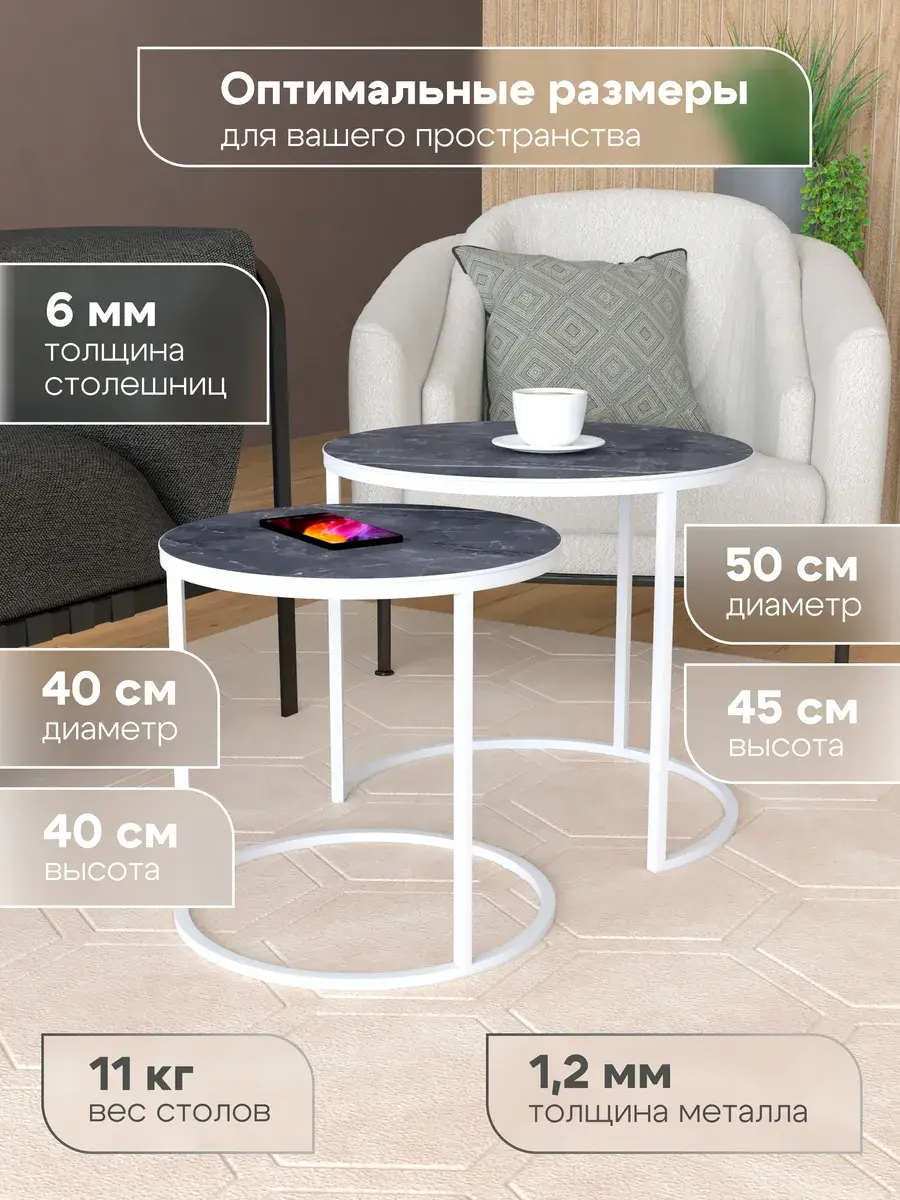 Воплотите дизайнерские решения мирового класса в своем доме с этим изящным круглый журнальный столик. Этот стильный комплект включает два стола: большой диаметром 50 см и высотой 45 см, а также малый диаметром 40 см и высотой 40 см. Этот стол круглый может использоваться как столик прикроватный, добавляя функциональность в спальню. Элегантные металлические ножки с полиуретановым покрытием обеспечивают надежность. Приставной столик выполнен в лучших традициях современного дизайна. Столик журнальный выполнен в лучших традициях современного дизайна. Вы можете выбрать из 24 вариантов цветовых решений, что позволит идеально вписать столики в ваш интерьер. Закажите прямо сейчас и наслаждайтесь красотой каждый день!