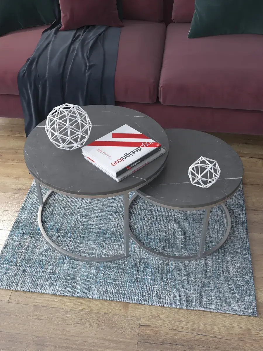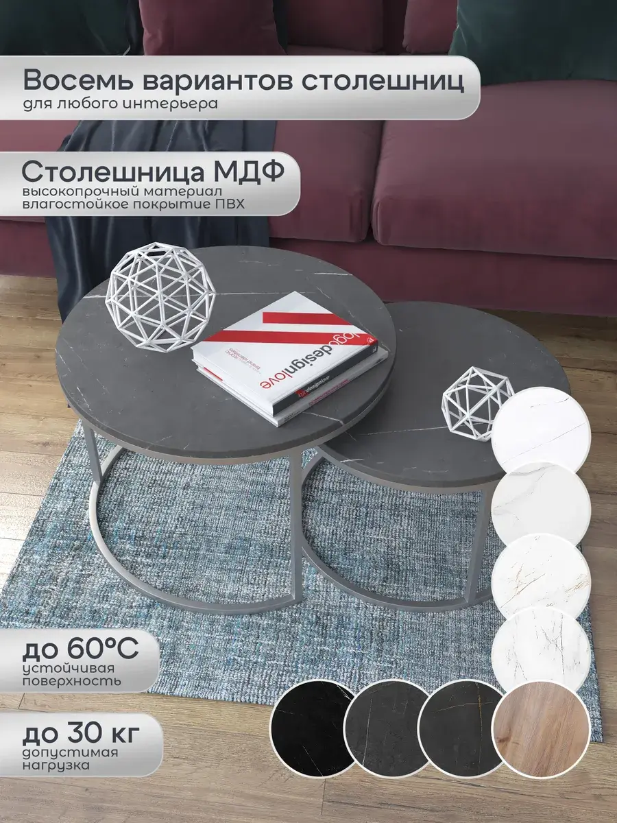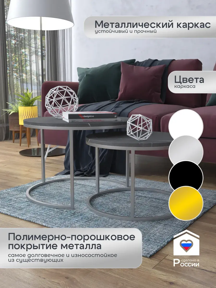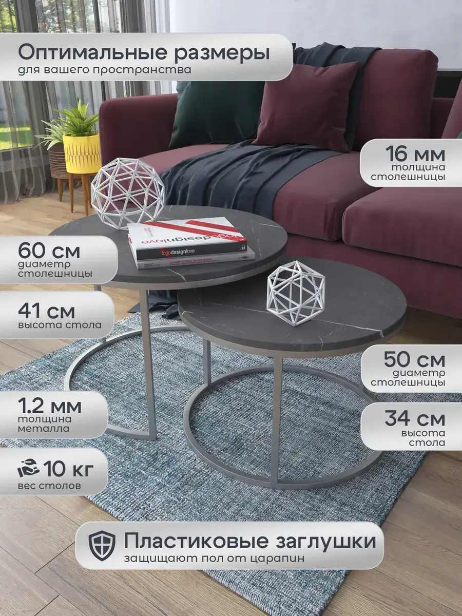 Пара журнальных столов "Акцент" — это стильное и функциональное дополнение к вашему интерьеру. Его уникальный дизайн и высокое качество сразу привлекают внимание. Столешницы влагостойкие, а основания покрыты прочной полимерно-порошковой краской. Благодаря этому они не только привлекательно выглядят, но и очень практичны. Конструкция столиков надёжна, они выдерживают нагрузку на столешницу до 30 кг. Это позволяет разместить на них различные предметы декора или напитки. Высота большего стола 41см, диаметр - 60см; высота малого столика - 34см, диаметр - 50см. Цвет основания: серебро, столешницы: мрамор черный матовый. Основание выполнено из квадратной профильной трубы 15х15 толщиной 1.2мм Эти журнальные столики удобны в использовании. Они не царапают пол и не шатаются, обеспечивая дополнительный комфорт при эксплуатации. Производство в России гарантирует высокое качество товара и его соответствие всем стандартам. Кроме того, столики поставляются уже собранными. Вам не придётся тратить время и силы на их сборку. Просто распакуйте и наслаждайтесь преимуществами этих прекрасных изделий. Круглые журнальные столики со столешницей под мрамор — это не просто мебель. Это настоящее произведение искусства, которое подчеркнёт ваш вкус и станет главным акцентом в вашем доме. Покупая эти столики, вы получаете не только функциональную мебель, но и предмет декора, который добавит шарма и уюта в ваше пространство. Не упустите возможность купить эти уникальные журнальные столики и создать уютный уголок в вашем доме,на радость каждый день.