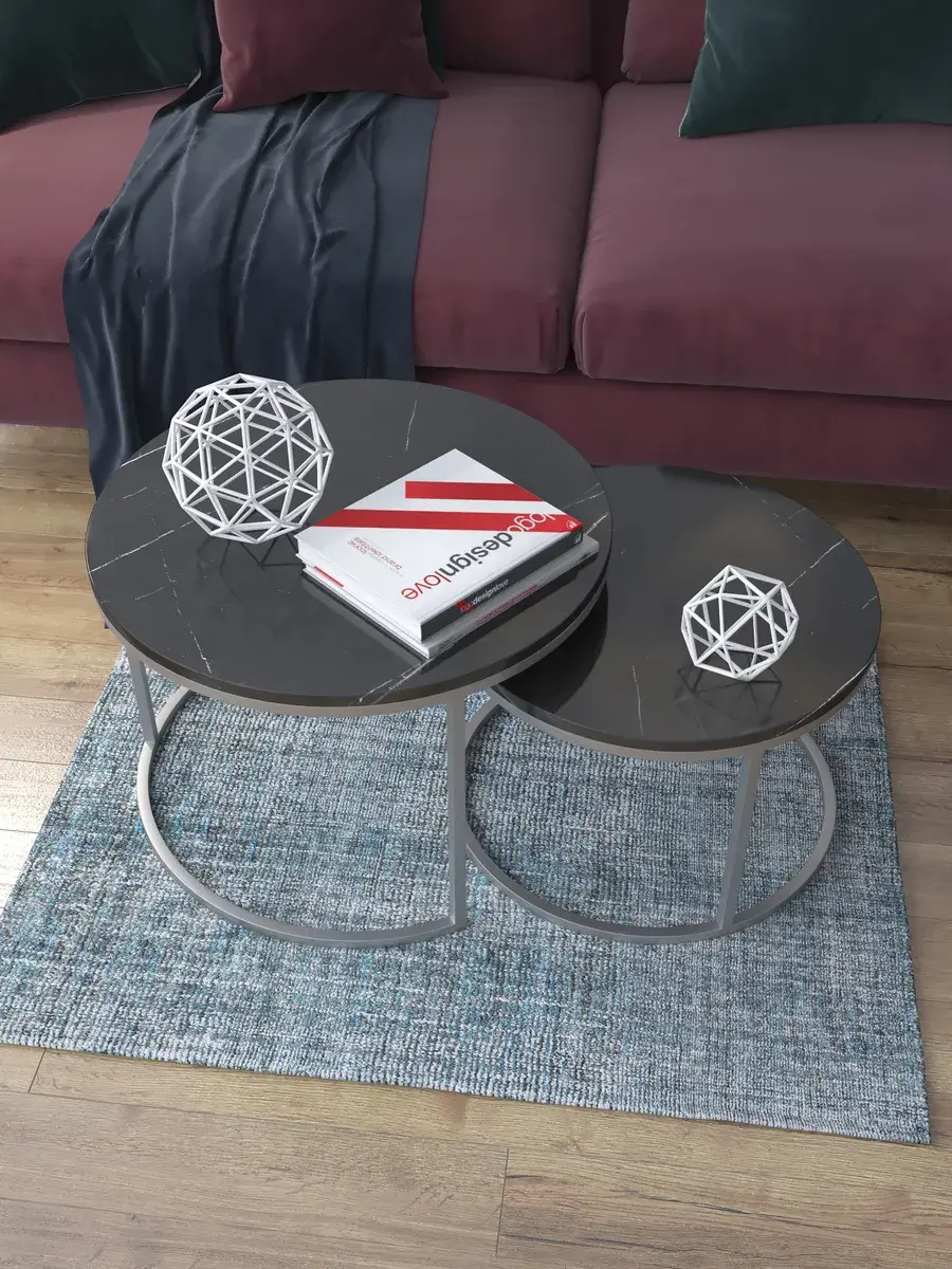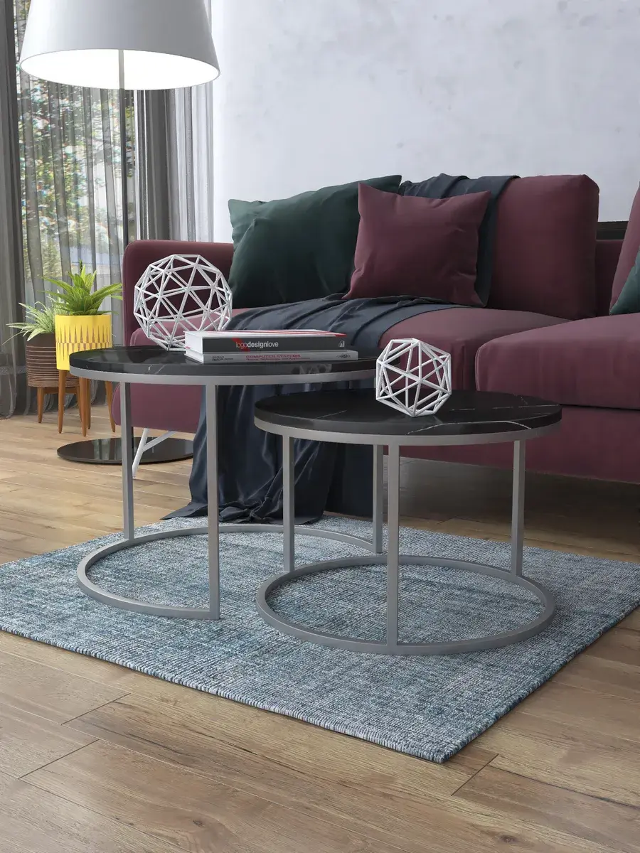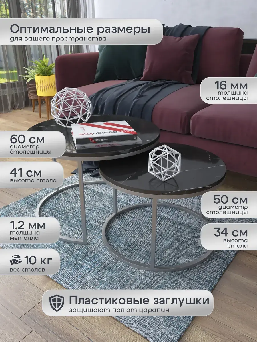 Пара журнальных столов "Акцент" — это стильное и функциональное дополнение к вашему интерьеру. Его уникальный дизайн и высокое качество сразу привлекают внимание. Столешницы влагостойкие, а основания покрыты прочной полимерно-порошковой краской. Благодаря этому они не только привлекательно выглядят, но и очень практичны. Конструкция столиков надёжна, они выдерживают нагрузку на столешницу до 30 кг. Это позволяет разместить на них различные предметы декора или напитки. Высота большего стола 41см, диаметр - 60см; высота малого столика - 34см, диаметр - 50см. Цвет основания: серебро, столешницы: мрамор черный глянцевый. Основание выполнено из квадратной профильной трубы 15х15 толщиной 1.2мм Эти журнальные столики удобны в использовании. Они не царапают пол и не шатаются, обеспечивая дополнительный комфорт при эксплуатации. Производство в России гарантирует высокое качество товара и его соответствие всем стандартам. Кроме того, столики поставляются уже собранными. Вам не придётся тратить время и силы на их сборку. Просто распакуйте и наслаждайтесь преимуществами этих прекрасных изделий. Круглые журнальные столики со столешницей под мрамор — это не просто мебель. Это настоящее произведение искусства, которое подчеркнёт ваш вкус и станет главным акцентом в вашем доме. Покупая эти столики, вы получаете не только функциональную мебель, но и предмет декора, который добавит шарма и уюта в ваше пространство. Не упустите возможность купить эти уникальные журнальные столики и создать уютный уголок в вашем доме,на радость каждый день.