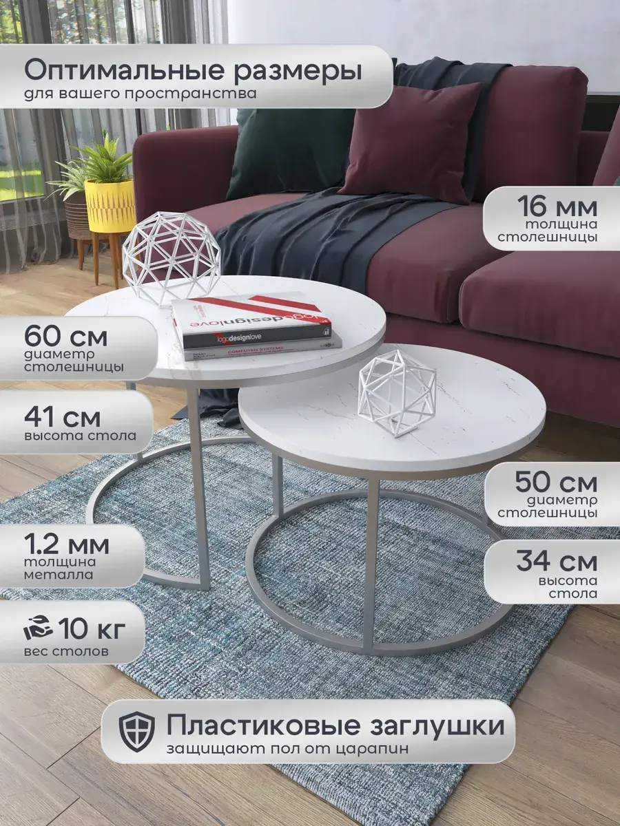 Пара журнальных столов "Акцент" — это стильное и функциональное дополнение к вашему интерьеру. Его уникальный дизайн и высокое качество сразу привлекают внимание. Столешницы влагостойкие, а основания покрыты прочной полимерно-порошковой краской. Благодаря этому они не только привлекательно выглядят, но и очень практичны. Конструкция столиков надёжна, они выдерживают нагрузку на столешницу до 30 кг. Это позволяет разместить на них различные предметы декора или напитки. Высота большего стола 41см, диаметр - 60см; высота малого столика - 34см, диаметр - 50см. Цвет основания: серебро, столешницы: мрамор золото белый глянцевый. Основание выполнено из квадратной профильной трубы 15х15 толщиной 1.2мм Эти журнальные столики удобны в использовании. Они не царапают пол и не шатаются, обеспечивая дополнительный комфорт при эксплуатации. Производство в России гарантирует высокое качество товара и его соответствие всем стандартам. Кроме того, столики поставляются уже собранными. Вам не придётся тратить время и силы на их сборку. Просто распакуйте и наслаждайтесь преимуществами этих прекрасных изделий. Круглые журнальные столики со столешницей под мрамор — это не просто мебель. Это настоящее произведение искусства, которое подчеркнёт ваш вкус и станет главным акцентом в вашем доме. Покупая эти столики, вы получаете не только функциональную мебель, но и предмет декора, который добавит шарма и уюта в ваше пространство. Не упустите возможность купить эти уникальные журнальные столики и создать уютный уголок в вашем доме,на радость каждый день.