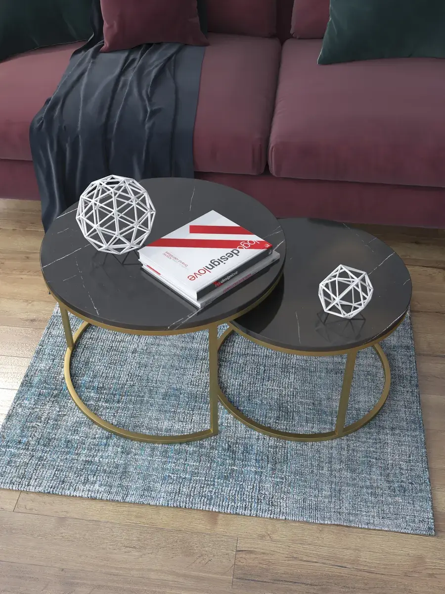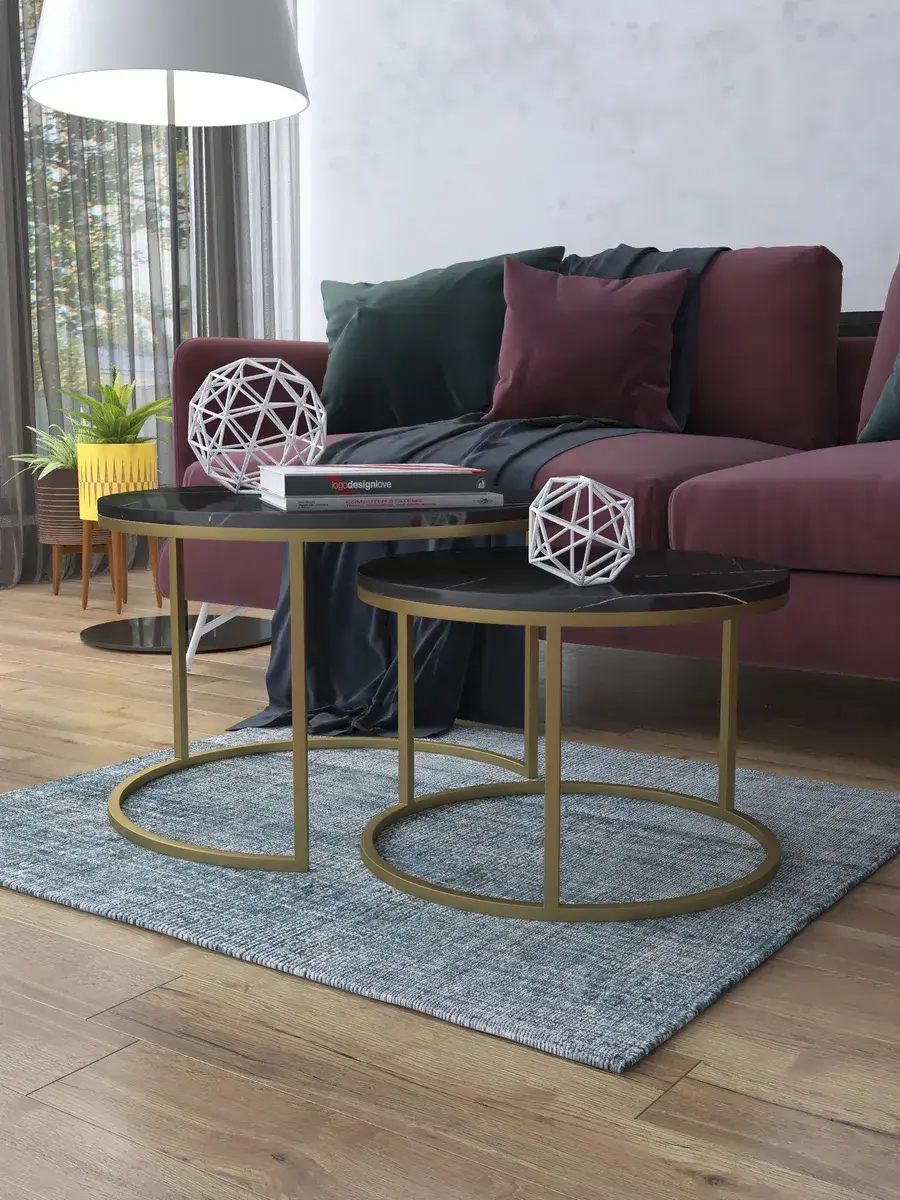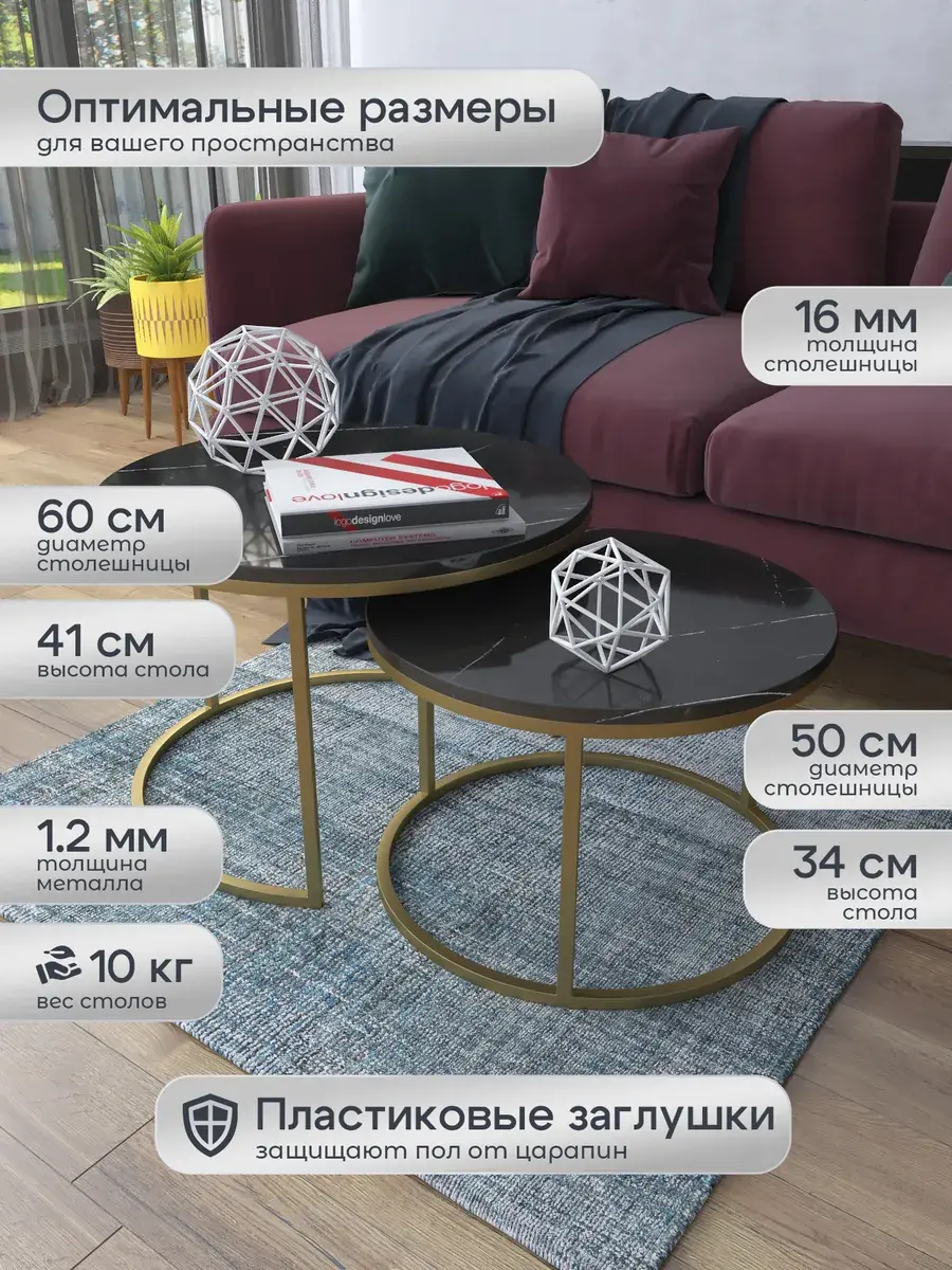 Пара журнальных столов "Акцент" — это стильное и функциональное дополнение к вашему интерьеру. Его уникальный дизайн и высокое качество сразу привлекают внимание. Столешницы влагостойкие, а основания покрыты прочной полимерно-порошковой краской. Благодаря этому они не только привлекательно выглядят, но и очень практичны. Конструкция столиков надёжна, они выдерживают нагрузку на столешницу до 30 кг. Это позволяет разместить на них различные предметы декора или напитки. Высота большего стола 41см, диаметр - 60см; высота малого столика - 34см, диаметр - 50см. Цвет основания: золото, столешницы: мрамор черный глянцевый. Основание выполнено из квадратной профильной трубы 15х15 толщиной 1.2мм Эти журнальные столики удобны в использовании. Они не царапают пол и не шатаются, обеспечивая дополнительный комфорт при эксплуатации. Производство в России гарантирует высокое качество товара и его соответствие всем стандартам. Кроме того, столики поставляются уже собранными. Вам не придётся тратить время и силы на их сборку. Просто распакуйте и наслаждайтесь преимуществами этих прекрасных изделий. Круглые журнальные столики со столешницей под мрамор — это не просто мебель. Это настоящее произведение искусства, которое подчеркнёт ваш вкус и станет главным акцентом в вашем доме. Покупая эти столики, вы получаете не только функциональную мебель, но и предмет декора, который добавит шарма и уюта в ваше пространство. Не упустите возможность купить эти уникальные журнальные столики и создать уютный уголок в вашем доме,на радость каждый день.