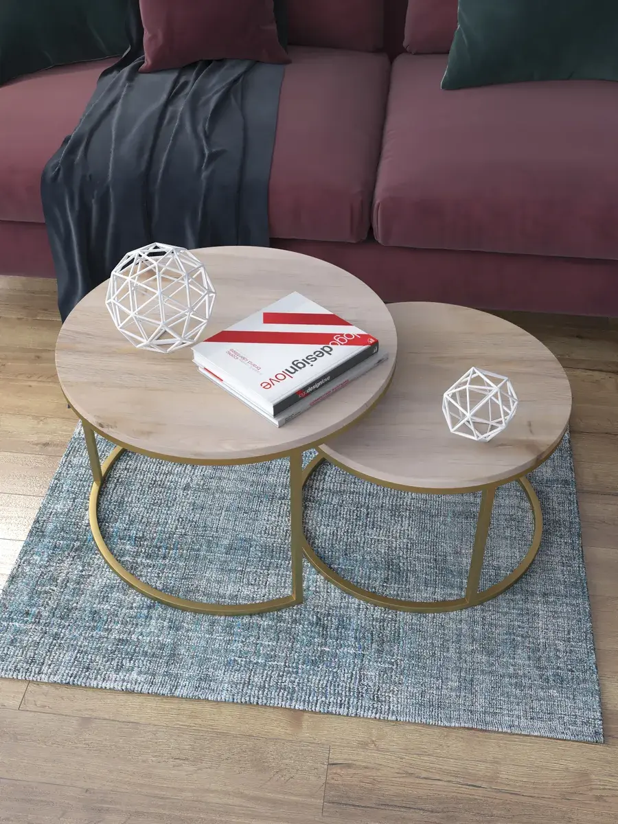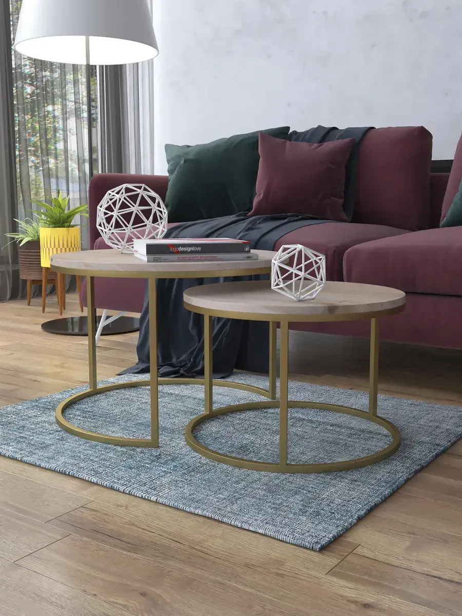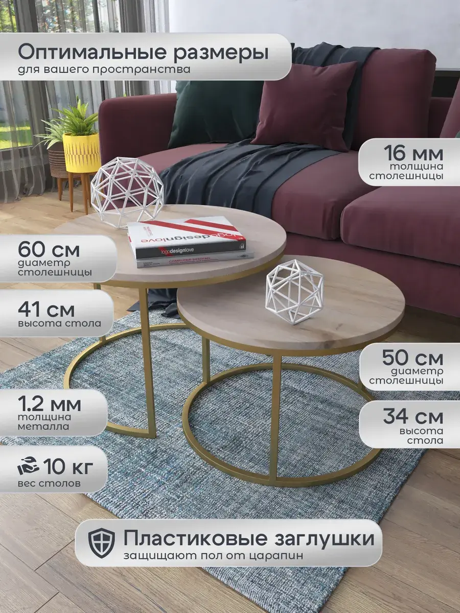 Пара журнальных столов "Акцент" — это стильное и функциональное дополнение к вашему интерьеру. Его уникальный дизайн и высокое качество сразу привлекают внимание. Столешницы влагостойкие, а основания покрыты прочной полимерно-порошковой краской. Благодаря этому они не только привлекательно выглядят, но и очень практичны. Конструкция столиков надёжна, они выдерживают нагрузку на столешницу до 30 кг. Это позволяет разместить на них различные предметы декора или напитки. Высота большего стола 41см, диаметр - 60см; высота малого столика - 34см, диаметр - 50см. Цвет основания: золото, столешницы: дуб натуральный. Основание выполнено из квадратной профильной трубы 15х15 толщиной 1.2мм Эти журнальные столики удобны в использовании. Они не царапают пол и не шатаются, обеспечивая дополнительный комфорт при эксплуатации. Производство в России гарантирует высокое качество товара и его соответствие всем стандартам. Кроме того, столики поставляются уже собранными. Вам не придётся тратить время и силы на их сборку. Просто распакуйте и наслаждайтесь преимуществами этих прекрасных изделий. Круглые журнальные столики со столешницей под мрамор — это не просто мебель. Это настоящее произведение искусства, которое подчеркнёт ваш вкус и станет главным акцентом в вашем доме. Покупая эти столики, вы получаете не только функциональную мебель, но и предмет декора, который добавит шарма и уюта в ваше пространство. Не упустите возможность купить эти уникальные журнальные столики и создать уютный уголок в вашем доме,на радость каждый день.