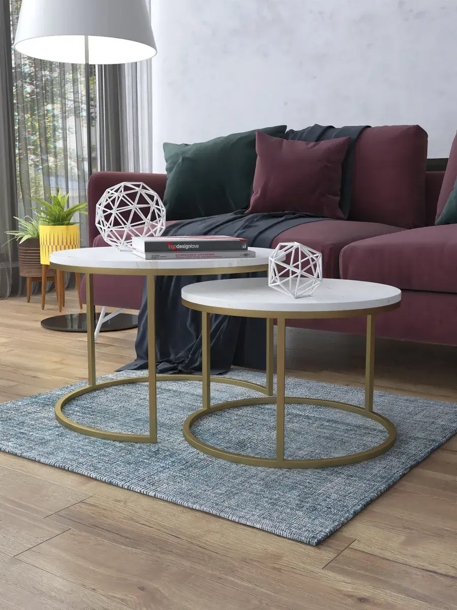 Пара журнальных столов "Акцент" — это стильное и функциональное дополнение к вашему интерьеру. Его уникальный дизайн и высокое качество сразу привлекают внимание. Столешницы влагостойкие, а основания покрыты прочной полимерно-порошковой краской. Благодаря этому они не только привлекательно выглядят, но и очень практичны. Конструкция столиков надёжна, они выдерживают нагрузку на столешницу до 30 кг. Это позволяет разместить на них различные предметы декора или напитки. Высота большего стола 41см, диаметр - 60см; высота малого столика - 34см, диаметр - 50см. Цвет основания: золото, столешницы: мрамор золото белый глянцевый. Основание выполнено из квадратной профильной трубы 15х15 толщиной 1.2мм Эти журнальные столики удобны в использовании. Они не царапают пол и не шатаются, обеспечивая дополнительный комфорт при эксплуатации. Производство в России гарантирует высокое качество товара и его соответствие всем стандартам. Кроме того, столики поставляются уже собранными. Вам не придётся тратить время и силы на их сборку. Просто распакуйте и наслаждайтесь преимуществами этих прекрасных изделий. Круглые журнальные столики со столешницей под мрамор — это не просто мебель. Это настоящее произведение искусства, которое подчеркнёт ваш вкус и станет главным акцентом в вашем доме. Покупая эти столики, вы получаете не только функциональную мебель, но и предмет декора, который добавит шарма и уюта в ваше пространство. Не упустите возможность купить эти уникальные журнальные столики и создать уютный уголок в вашем доме,на радость каждый день.