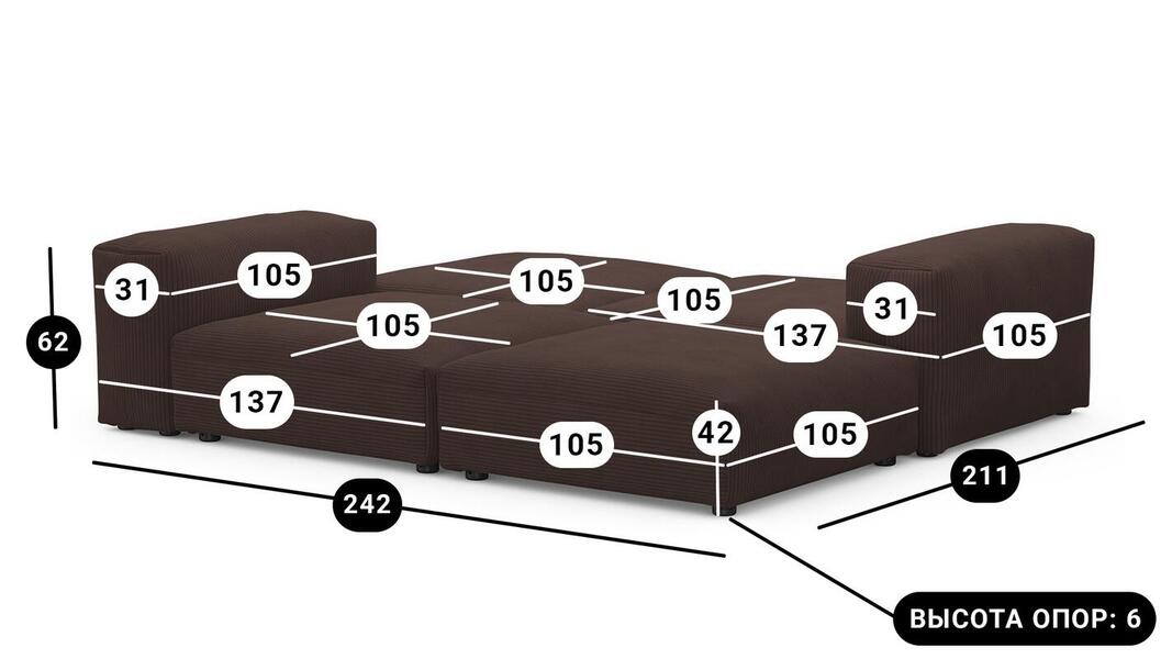 Мебель напрямую от фабрики. Можем менять габариты, цвет, варианты обивки и фасадов. Диван Фиджи отличается высоким качеством материалов и сборки, что гарантирует долговечность и надежность. Современный дизайн гармонично впишется в любой интерьер, а продуманная эргономика обеспечит максимальный комфорт. Преимущества дивана Фиджи Высокое качество и долговечность Современный и стильный дизайн Продуманная эргономика для максимального комфорта Простота в уходе и обслуживании Диван Фиджи - идеальное решение для тех, кто ценит качество, комфорт и красоту. Весь ассортимент мебели от фабрики производится по самым высоким стандартам с использованием передовых технологий. Мы гарантируем безупречное качество каждого изделия и полное соответствие всем необходимым нормам и требованиям. Жизнь не стоит на месте: все меняется, мы растем, а иногда просто чувствуем, что пришло время снова что-то менять. Наши диванные модули разработаны таким образом, чтобы Вы могли легко дополнять или изменять расположение или заново создавать свой образ (за счет соединителей, которые приобретаются дополнительно). Модульные транформеры Фиджи позволят Вам создать уникальный предмет мебели, отражающий Вашу индивидуальность и стиль жизни. Смешивайте и подбирайте ткани и размеры, а также добавляйте дополнительные модули, чтобы создать свой фирменный диван. Кушетка, на которой можно свернуться калачиком и почитать книгу, диван, на котором можно вздремнуть или большой гостиный гарнитур для всей семьи - наши диванные модули мгновенно позволят Вам почувствовать комфорт. Характеристики дивана Фиджи Функциональность Диван для отдыха Исполнение Комплектация: 2 пуфа со спинкой 105*137 см, 2 пуфа 105*105 см Обивочный материал: вельвет Cilium Chocolate Опоры: пластик ППУ 3040 Механизм трансформации Трансформер Нераскладной Габариты (Ширина*Глубина*Высота) 242*211*62 см Гарантия: 18 месяцев Обновлено:22.02.2026