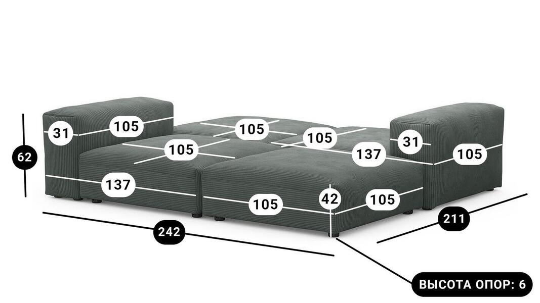 Мебель напрямую от фабрики. Можем менять габариты, цвет, варианты обивки и фасадов. Диван Фиджи отличается высоким качеством материалов и сборки, что гарантирует долговечность и надежность. Современный дизайн гармонично впишется в любой интерьер, а продуманная эргономика обеспечит максимальный комфорт. Преимущества дивана Фиджи Высокое качество и долговечность Современный и стильный дизайн Продуманная эргономика для максимального комфорта Простота в уходе и обслуживании Диван Фиджи - идеальное решение для тех, кто ценит качество, комфорт и красоту. Весь ассортимент мебели от фабрики производится по самым высоким стандартам с использованием передовых технологий. Мы гарантируем безупречное качество каждого изделия и полное соответствие всем необходимым нормам и требованиям. Жизнь не стоит на месте: все меняется, мы растем, а иногда просто чувствуем, что пришло время снова что-то менять. Наши диванные модули разработаны таким образом, чтобы Вы могли легко дополнять или изменять расположение или заново создавать свой образ (за счет соединителей, которые приобретаются дополнительно). Модульные транформеры Фиджи позволят Вам создать уникальный предмет мебели, отражающий Вашу индивидуальность и стиль жизни. Смешивайте и подбирайте ткани и размеры, а также добавляйте дополнительные модули, чтобы создать свой фирменный диван. Кушетка, на которой можно свернуться калачиком и почитать книгу, диван, на котором можно вздремнуть или большой гостиный гарнитур для всей семьи - наши диванные модули мгновенно позволят Вам почувствовать комфорт. Характеристики дивана Фиджи Функциональность Диван для отдыха Исполнение Комплектация: 2 пуфа со спинкой 105*137 см, 2 пуфа 105*105 см Обивочный материал: вельвет Cilium Grafit Опоры: пластик ППУ 3040 Механизм трансформации Трансформер Нераскладной Габариты (Ширина*Глубина*Высота) 242*211*62 см Гарантия: 18 месяцев Обновлено:22.02.2026
