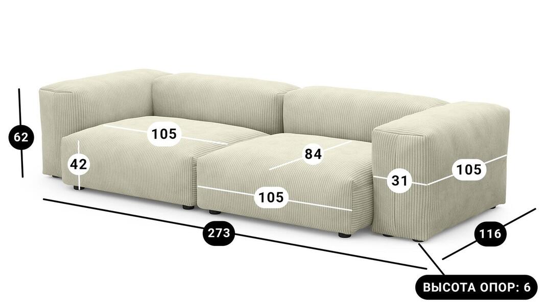 Мебель напрямую от фабрики. Можем менять габариты, цвет, варианты обивки и фасадов. Диван Фиджи двухсекционный (большой) отличается высоким качеством материалов и сборки, что гарантирует долговечность и надежность. Современный дизайн гармонично впишется в любой интерьер, а продуманная эргономика обеспечит максимальный комфорт. Преимущества дивана Фиджи двухсекционного (большого) Высокое качество и долговечность Современный и стильный дизайн Продуманная эргономика для максимального комфорта Простота в уходе и обслуживании Диван Фиджи двухсекционный (большой) - идеальное решение для тех, кто ценит качество, комфорт и красоту. Весь ассортимент мебели от фабрики производится по самым высоким стандартам с использованием передовых технологий. Мы гарантируем безупречное качество каждого изделия и полное соответствие всем необходимым нормам и требованиям. Жизнь не стоит на месте: все меняется, мы растем, а иногда просто чувствуем, что пришло время снова что-то менять. Наши диванные модули разработаны таким образом, чтобы Вы могли легко дополнять или изменять расположение или заново создавать свой образ (за счет соединителей, которые приобретаются дополнительно). Модульные транформеры Фиджи позволят Вам создать уникальный предмет мебели, отражающий Вашу индивидуальность и стиль жизни. Смешивайте и подбирайте ткани и размеры, а также добавляйте дополнительные модули, чтобы создать свой фирменный диван. Кушетка, на которой можно свернуться калачиком и почитать книгу, диван, на котором можно вздремнуть или большой гостиный гарнитур для всей семьи - наши диванные модули мгновенно позволят Вам почувствовать комфорт. Характеристики дивана Фиджи двухсекционный (большой) Функциональность Диван для отдыха Исполнение Комплектация: 2 пуфа со спинкой 105*84 см, 2 подлокотника 105*31 см Обивочный материал: вельвет Cilium Bone Опоры: пластик; ППУ 3040 Механизм трансформации Трансформер Нераскладной Габариты (Ширина*Глубина*Высота) 273*116*62 см Гарантия: 18 месяцев Обновлено:22.02.2026