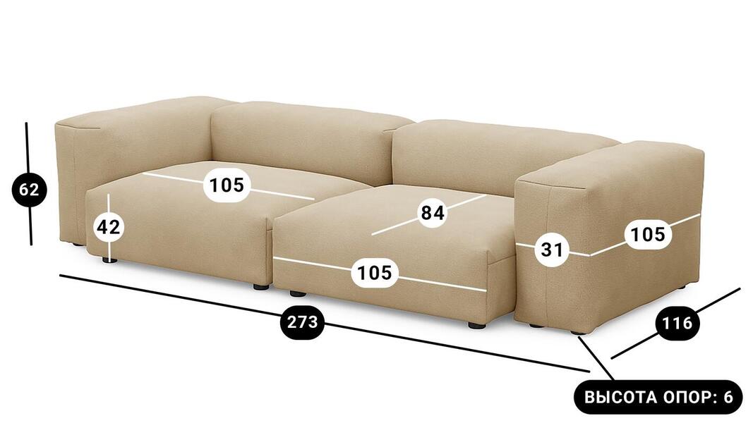 Мебель напрямую от фабрики. Можем менять габариты, цвет, варианты обивки и фасадов. Диван Фиджи двухсекционный (большой) отличается высоким качеством материалов и сборки, что гарантирует долговечность и надежность. Современный дизайн гармонично впишется в любой интерьер, а продуманная эргономика обеспечит максимальный комфорт. Преимущества дивана Фиджи двухсекционного (большого) Высокое качество и долговечность Современный и стильный дизайн Продуманная эргономика для максимального комфорта Простота в уходе и обслуживании Диван Фиджи двухсекционный (большой) - идеальное решение для тех, кто ценит качество, комфорт и красоту. Весь ассортимент мебели от фабрики производится по самым высоким стандартам с использованием передовых технологий. Мы гарантируем безупречное качество каждого изделия и полное соответствие всем необходимым нормам и требованиям. Жизнь не стоит на месте: все меняется, мы растем, а иногда просто чувствуем, что пришло время снова что-то менять. Наши диванные модули разработаны таким образом, чтобы Вы могли легко дополнять или изменять расположение или заново создавать свой образ (за счет соединителей, которые приобретаются дополнительно). Модульные транформеры Фиджи позволят Вам создать уникальный предмет мебели, отражающий Вашу индивидуальность и стиль жизни. Смешивайте и подбирайте ткани и размеры, а также добавляйте дополнительные модули, чтобы создать свой фирменный диван. Кушетка, на которой можно свернуться калачиком и почитать книгу, диван, на котором можно вздремнуть или большой гостиный гарнитур для всей семьи - наши диванные модули мгновенно позволят Вам почувствовать комфорт. Характеристики дивана Фиджи двухсекционный (большой) Функциональность Диван для отдыха Исполнение Комплектация: 2 пуфа со спинкой 105*84 см, 2 подлокотника 105*31 см Обивочный материал: Союз М Velutto 02 (велюр) Опоры: пластик; ППУ 3040 Механизм трансформации Трансформер Нераскладной Габариты (Ширина*Глубина*Высота) 273*116*62 см Гарантия: 18 месяцев Обновлено:22.02.2026