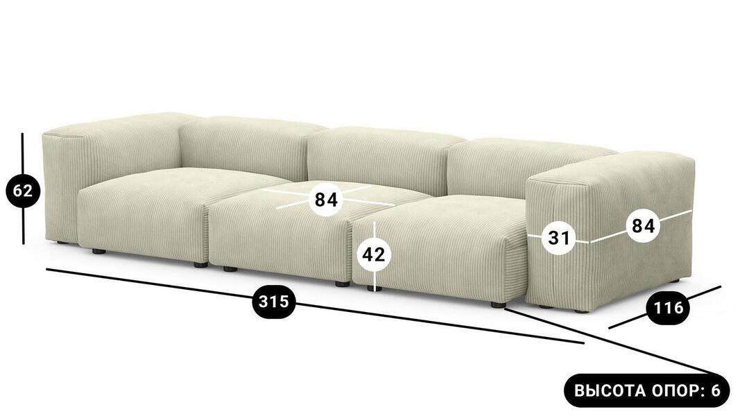 Мебель напрямую от фабрики. Можем менять габариты, цвет, варианты обивки и фасадов. Диван Фиджи трехсекционный отличается высоким качеством материалов и сборки, что гарантирует долговечность и надежность. Современный дизайн гармонично впишется в любой интерьер, а продуманная эргономика обеспечит максимальный комфорт. Преимущества дивана Фиджи трехсекционного Высокое качество и долговечность Современный и стильный дизайн Продуманная эргономика для максимального комфорта Простота в уходе и обслуживании Диван Фиджи трехсекционный - идеальное решение для тех, кто ценит качество, комфорт и красоту. Весь ассортимент мебели от фабрики производится по самым высоким стандартам с использованием передовых технологий. Мы гарантируем безупречное качество каждого изделия и полное соответствие всем необходимым нормам и требованиям. Жизнь не стоит на месте: все меняется, мы растем, а иногда просто чувствуем, что пришло время снова что-то менять. Наши диванные модули разработаны таким образом, чтобы Вы могли легко дополнять или изменять расположение или заново создавать свой образ (за счет соединителей, которые приобретаются дополнительно). Модульные транформеры Фиджи позволят Вам создать уникальный предмет мебели, отражающий Вашу индивидуальность и стиль жизни. Смешивайте и подбирайте ткани и размеры, а также добавляйте дополнительные модули, чтобы создать свой фирменный диван. Кушетка, на которой можно свернуться калачиком и почитать книгу, диван, на котором можно вздремнуть или большой гостиный гарнитур для всей семьи - наши диванные модули мгновенно позволят Вам почувствовать комфорт. Характеристики дивана Фиджи трехсекционный Функциональность Диван для отдыха Исполнение Комплектация: 3 пуфа со спинкой 84*84 см, 2 подлокотника 84*31 см Обивочный материал: вельвет Arben Cilium Bone Опоры: пластик ППУ 3040 Механизм трансформации Трансформер Нераскладной Габариты (Ширина*Глубина*Высота) 315*116*62 см Гарантия: 18 месяцев Обновлено:22.02.2026