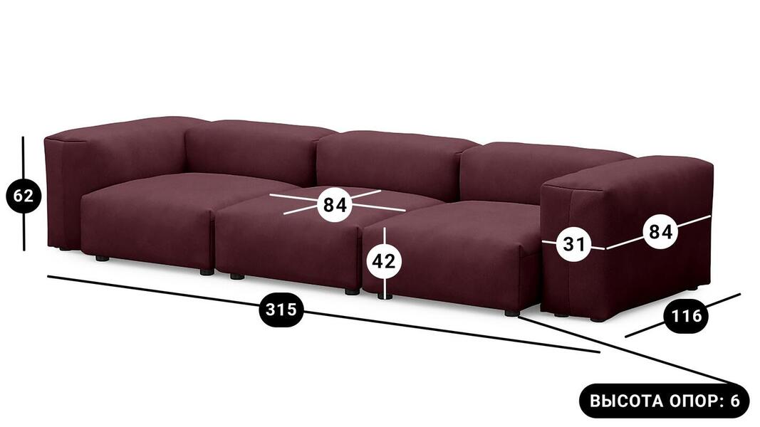 Мебель напрямую от фабрики. Можем менять габариты, цвет, варианты обивки и фасадов. Диван Фиджи трехсекционный отличается высоким качеством материалов и сборки, что гарантирует долговечность и надежность. Современный дизайн гармонично впишется в любой интерьер, а продуманная эргономика обеспечит максимальный комфорт. Преимущества дивана Фиджи трехсекционного Высокое качество и долговечность Современный и стильный дизайн Продуманная эргономика для максимального комфорта Простота в уходе и обслуживании Диван Фиджи трехсекционный - идеальное решение для тех, кто ценит качество, комфорт и красоту. Весь ассортимент мебели от фабрики производится по самым высоким стандартам с использованием передовых технологий. Мы гарантируем безупречное качество каждого изделия и полное соответствие всем необходимым нормам и требованиям. Жизнь не стоит на месте: все меняется, мы растем, а иногда просто чувствуем, что пришло время снова что-то менять. Наши диванные модули разработаны таким образом, чтобы Вы могли легко дополнять или изменять расположение или заново создавать свой образ (за счет соединителей, которые приобретаются дополнительно). Модульные транформеры Фиджи позволят Вам создать уникальный предмет мебели, отражающий Вашу индивидуальность и стиль жизни. Смешивайте и подбирайте ткани и размеры, а также добавляйте дополнительные модули, чтобы создать свой фирменный диван. Кушетка, на которой можно свернуться калачиком и почитать книгу, диван, на котором можно вздремнуть или большой гостиный гарнитур для всей семьи - наши диванные модули мгновенно позволят Вам почувствовать комфорт. Характеристики дивана Фиджи трехсекционный Функциональность Диван для отдыха Исполнение Комплектация: 3 пуфа со спинкой 84*84 см, 2 подлокотника 84*31 см Обивочный материал: Союз М Velutto 15 (велюр) Опоры: пластик ППУ 3040 Механизм трансформации Трансформер Нераскладной Габариты (Ширина*Глубина*Высота) 315*116*62 см Гарантия: 18 месяцев Обновлено:22.02.2026