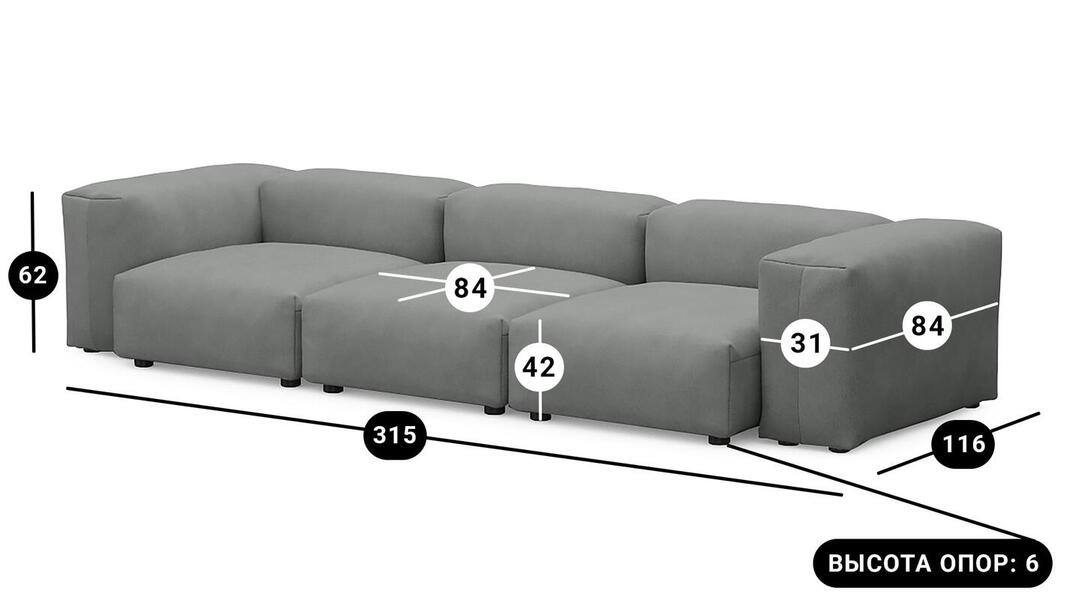 Мебель напрямую от фабрики. Можем менять габариты, цвет, варианты обивки и фасадов. Диван Фиджи трехсекционный отличается высоким качеством материалов и сборки, что гарантирует долговечность и надежность. Современный дизайн гармонично впишется в любой интерьер, а продуманная эргономика обеспечит максимальный комфорт. Преимущества дивана Фиджи трехсекционного Высокое качество и долговечность Современный и стильный дизайн Продуманная эргономика для максимального комфорта Простота в уходе и обслуживании Диван Фиджи трехсекционный - идеальное решение для тех, кто ценит качество, комфорт и красоту. Весь ассортимент мебели от фабрики производится по самым высоким стандартам с использованием передовых технологий. Мы гарантируем безупречное качество каждого изделия и полное соответствие всем необходимым нормам и требованиям. Жизнь не стоит на месте: все меняется, мы растем, а иногда просто чувствуем, что пришло время снова что-то менять. Наши диванные модули разработаны таким образом, чтобы Вы могли легко дополнять или изменять расположение или заново создавать свой образ (за счет соединителей, которые приобретаются дополнительно). Модульные транформеры Фиджи позволят Вам создать уникальный предмет мебели, отражающий Вашу индивидуальность и стиль жизни. Смешивайте и подбирайте ткани и размеры, а также добавляйте дополнительные модули, чтобы создать свой фирменный диван. Кушетка, на которой можно свернуться калачиком и почитать книгу, диван, на котором можно вздремнуть или большой гостиный гарнитур для всей семьи - наши диванные модули мгновенно позволят Вам почувствовать комфорт. Характеристики дивана Фиджи трехсекционный Функциональность Диван для отдыха Исполнение Комплектация: 3 пуфа со спинкой 84*84 см, 2 подлокотника 84*31 см Обивочный материал: Союз М Velutto 52 (велюр) Опоры: пластик ППУ 3040 Механизм трансформации Трансформер Нераскладной Габариты (Ширина*Глубина*Высота) 315*116*62 см Гарантия: 18 месяцев Обновлено:22.02.2026