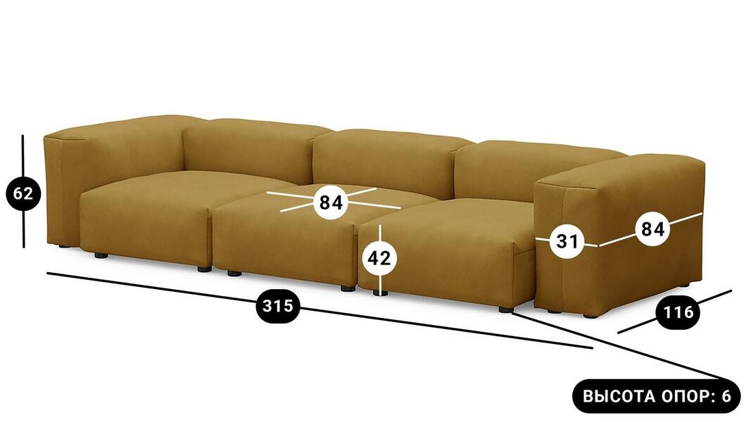 Мебель напрямую от фабрики. Можем менять габариты, цвет, варианты обивки и фасадов. Диван Фиджи трехсекционный отличается высоким качеством материалов и сборки, что гарантирует долговечность и надежность. Современный дизайн гармонично впишется в любой интерьер, а продуманная эргономика обеспечит максимальный комфорт. Преимущества дивана Фиджи трехсекционного Высокое качество и долговечность Современный и стильный дизайн Продуманная эргономика для максимального комфорта Простота в уходе и обслуживании Диван Фиджи трехсекционный - идеальное решение для тех, кто ценит качество, комфорт и красоту. Весь ассортимент мебели от фабрики производится по самым высоким стандартам с использованием передовых технологий. Мы гарантируем безупречное качество каждого изделия и полное соответствие всем необходимым нормам и требованиям. Жизнь не стоит на месте: все меняется, мы растем, а иногда просто чувствуем, что пришло время снова что-то менять. Наши диванные модули разработаны таким образом, чтобы Вы могли легко дополнять или изменять расположение или заново создавать свой образ (за счет соединителей, которые приобретаются дополнительно). Модульные транформеры Фиджи позволят Вам создать уникальный предмет мебели, отражающий Вашу индивидуальность и стиль жизни. Смешивайте и подбирайте ткани и размеры, а также добавляйте дополнительные модули, чтобы создать свой фирменный диван. Кушетка, на которой можно свернуться калачиком и почитать книгу, диван, на котором можно вздремнуть или большой гостиный гарнитур для всей семьи - наши диванные модули мгновенно позволят Вам почувствовать комфорт. Характеристики дивана Фиджи трехсекционный Функциональность Диван для отдыха Исполнение Комплектация: 3 пуфа со спинкой 84*84 см, 2 подлокотника 84*31 см Обивочный материал: Союз М Velutto 56 (велюр) Опоры: пластик ППУ 3040 Механизм трансформации Трансформер Нераскладной Габариты (Ширина*Глубина*Высота) 315*116*62 см Гарантия: 18 месяцев Обновлено:22.02.2026