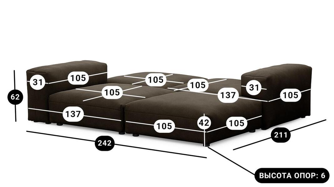 Мебель напрямую от фабрики. Можем менять габариты, цвет, варианты обивки и фасадов. Диван Фиджи отличается высоким качеством материалов и сборки, что гарантирует долговечность и надежность. Современный дизайн гармонично впишется в любой интерьер, а продуманная эргономика обеспечит максимальный комфорт. Преимущества дивана Фиджи Высокое качество и долговечность Современный и стильный дизайн Продуманная эргономика для максимального комфорта Простота в уходе и обслуживании Диван Фиджи - идеальное решение для тех, кто ценит качество, комфорт и красоту. Весь ассортимент мебели от фабрики производится по самым высоким стандартам с использованием передовых технологий. Мы гарантируем безупречное качество каждого изделия и полное соответствие всем необходимым нормам и требованиям. Жизнь не стоит на месте: все меняется, мы растем, а иногда просто чувствуем, что пришло время снова что-то менять. Наши диванные модули разработаны таким образом, чтобы Вы могли легко дополнять или изменять расположение или заново создавать свой образ (за счет соединителей, которые приобретаются дополнительно). Модульные транформеры Фиджи позволят Вам создать уникальный предмет мебели, отражающий Вашу индивидуальность и стиль жизни. Смешивайте и подбирайте ткани и размеры, а также добавляйте дополнительные модули, чтобы создать свой фирменный диван. Кушетка, на которой можно свернуться калачиком и почитать книгу, диван, на котором можно вздремнуть или большой гостиный гарнитур для всей семьи - наши диванные модули мгновенно позволят Вам почувствовать комфорт. Характеристики дивана Фиджи Функциональность Диван для отдыха Исполнение Комплектация: 2 пуфа со спинкой 105*137 см, 2 пуфа 105*105 см Обивочный материал: Союз М Velutto 24 (велюр) Опоры: пластик ППУ 3040 Механизм трансформации Трансформер Нераскладной Габариты (Ширина*Глубина*Высота) 242*211*62 см Гарантия: 18 месяцев Обновлено:22.02.2026
