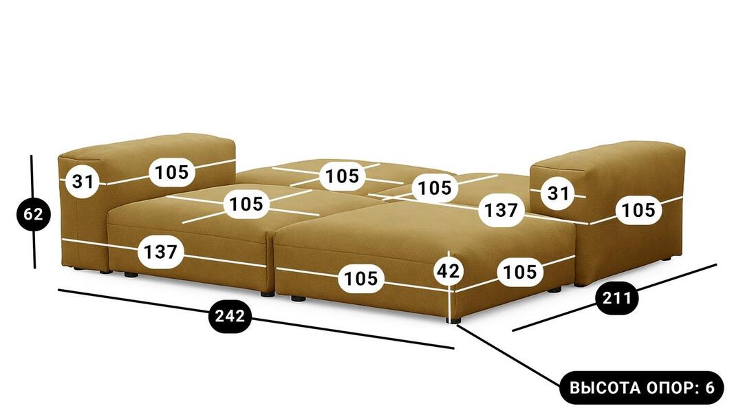 Мебель напрямую от фабрики. Можем менять габариты, цвет, варианты обивки и фасадов. Диван Фиджи отличается высоким качеством материалов и сборки, что гарантирует долговечность и надежность. Современный дизайн гармонично впишется в любой интерьер, а продуманная эргономика обеспечит максимальный комфорт. Преимущества дивана Фиджи Высокое качество и долговечность Современный и стильный дизайн Продуманная эргономика для максимального комфорта Простота в уходе и обслуживании Диван Фиджи - идеальное решение для тех, кто ценит качество, комфорт и красоту. Весь ассортимент мебели от фабрики производится по самым высоким стандартам с использованием передовых технологий. Мы гарантируем безупречное качество каждого изделия и полное соответствие всем необходимым нормам и требованиям. Жизнь не стоит на месте: все меняется, мы растем, а иногда просто чувствуем, что пришло время снова что-то менять. Наши диванные модули разработаны таким образом, чтобы Вы могли легко дополнять или изменять расположение или заново создавать свой образ (за счет соединителей, которые приобретаются дополнительно). Модульные транформеры Фиджи позволят Вам создать уникальный предмет мебели, отражающий Вашу индивидуальность и стиль жизни. Смешивайте и подбирайте ткани и размеры, а также добавляйте дополнительные модули, чтобы создать свой фирменный диван. Кушетка, на которой можно свернуться калачиком и почитать книгу, диван, на котором можно вздремнуть или большой гостиный гарнитур для всей семьи - наши диванные модули мгновенно позволят Вам почувствовать комфорт. Характеристики дивана Фиджи Функциональность Диван для отдыха Исполнение Комплектация: 2 пуфа со спинкой 105*137 см, 2 пуфа 105*105 см Обивочный материал: Союз М Velutto 56 (велюр) Опоры: пластик ППУ 3040 Механизм трансформации Трансформер Нераскладной Габариты (Ширина*Глубина*Высота) 242*211*62 см Гарантия: 18 месяцев Обновлено:22.02.2026