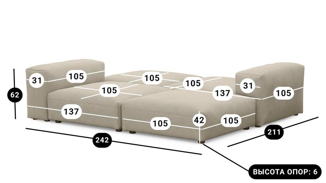 Мебель напрямую от фабрики. Можем менять габариты, цвет, варианты обивки и фасадов. Диван Фиджи отличается высоким качеством материалов и сборки, что гарантирует долговечность и надежность. Современный дизайн гармонично впишется в любой интерьер, а продуманная эргономика обеспечит максимальный комфорт. Преимущества дивана Фиджи Высокое качество и долговечность Современный и стильный дизайн Продуманная эргономика для максимального комфорта Простота в уходе и обслуживании Диван Фиджи - идеальное решение для тех, кто ценит качество, комфорт и красоту. Весь ассортимент мебели от фабрики производится по самым высоким стандартам с использованием передовых технологий. Мы гарантируем безупречное качество каждого изделия и полное соответствие всем необходимым нормам и требованиям. Жизнь не стоит на месте: все меняется, мы растем, а иногда просто чувствуем, что пришло время снова что-то менять. Наши диванные модули разработаны таким образом, чтобы Вы могли легко дополнять или изменять расположение или заново создавать свой образ (за счет соединителей, которые приобретаются дополнительно). Модульные транформеры Фиджи позволят Вам создать уникальный предмет мебели, отражающий Вашу индивидуальность и стиль жизни. Смешивайте и подбирайте ткани и размеры, а также добавляйте дополнительные модули, чтобы создать свой фирменный диван. Кушетка, на которой можно свернуться калачиком и почитать книгу, диван, на котором можно вздремнуть или большой гостиный гарнитур для всей семьи - наши диванные модули мгновенно позволят Вам почувствовать комфорт. Характеристики дивана Фиджи Функциональность Диван для отдыха Исполнение Комплектация: 2 пуфа со спинкой 105*137 см, 2 пуфа 105*105 см Обивочный материал: велюр Vektor Марал Vivaldi 04 Опоры: пластик ППУ 3040 Механизм трансформации Трансформер Нераскладной Габариты (Ширина*Глубина*Высота) 242*211*62 см Гарантия: 18 месяцев Обновлено:22.02.2026