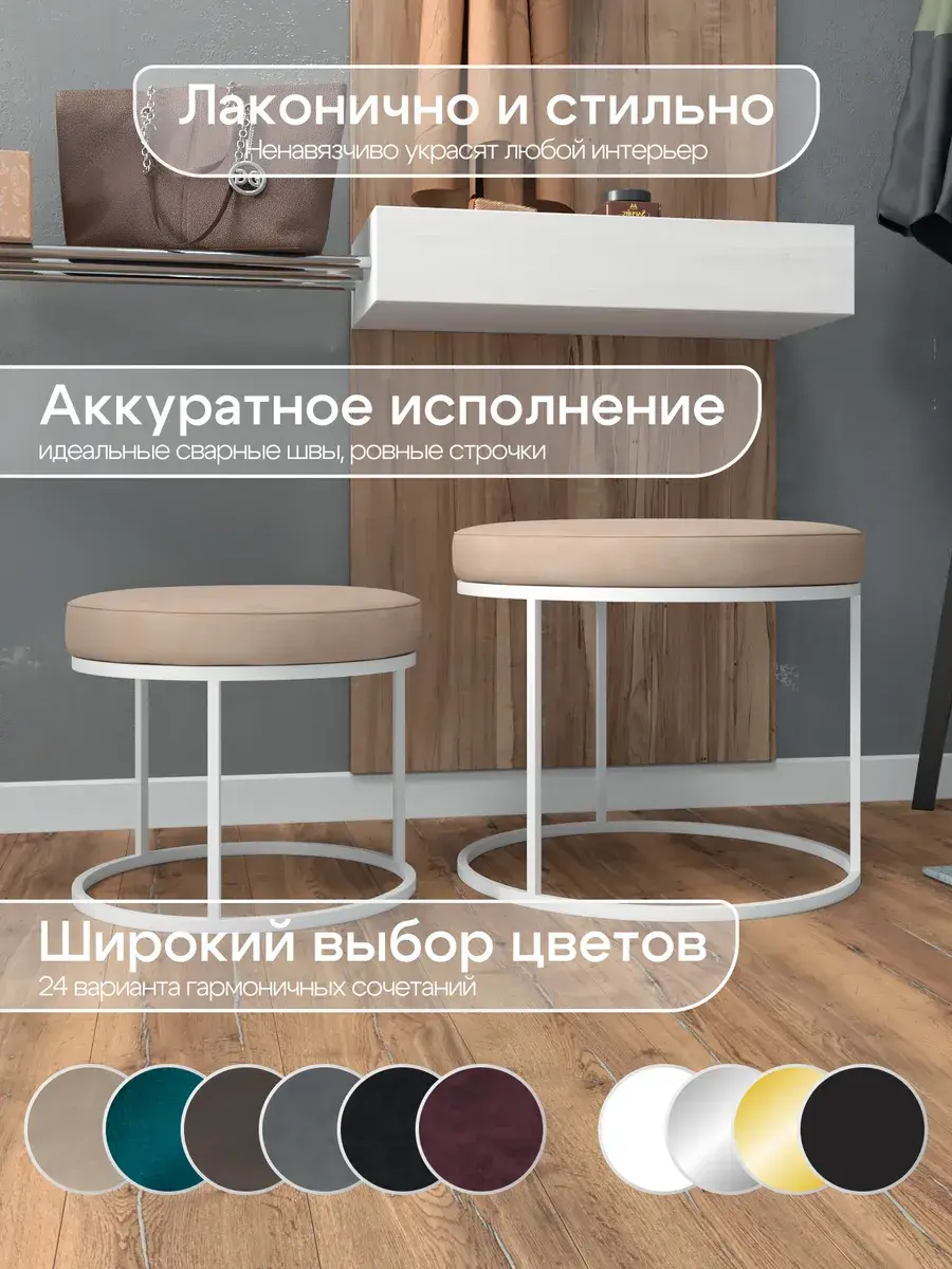 Пара пуфиков для гостиной — это стильный и функциональный предмет мебели. Они имеют прочное металлическое основание и мягкое сиденье, что делает их удобными и долговечными. Металлическое основание обеспечивает надёжность и прочность пуфиков, позволяя использовать их не только как сиденья, но и как небольшие столики или подставки для ног. Их конструкция позволяет легко перемещать пуфики по комнате, делая их универсальным решением для любого интерьера. Мягкая обивка пуфиков изготовлена из высококачественных материалов, которые сохранят свою первоначальную форму и цвет на протяжении долгого времени. Пуфики идеально подходят для гостиной, где они будут стильным акцентом и функциональным элементом. Вы сможете использовать их как дополнительное сиденье для гостей, как подставку для ног или как столик для различных предметов. Благодаря своим компактным размерам, пуфики не займут много места в вашей гостиной и легко впишутся в любой интерьер.