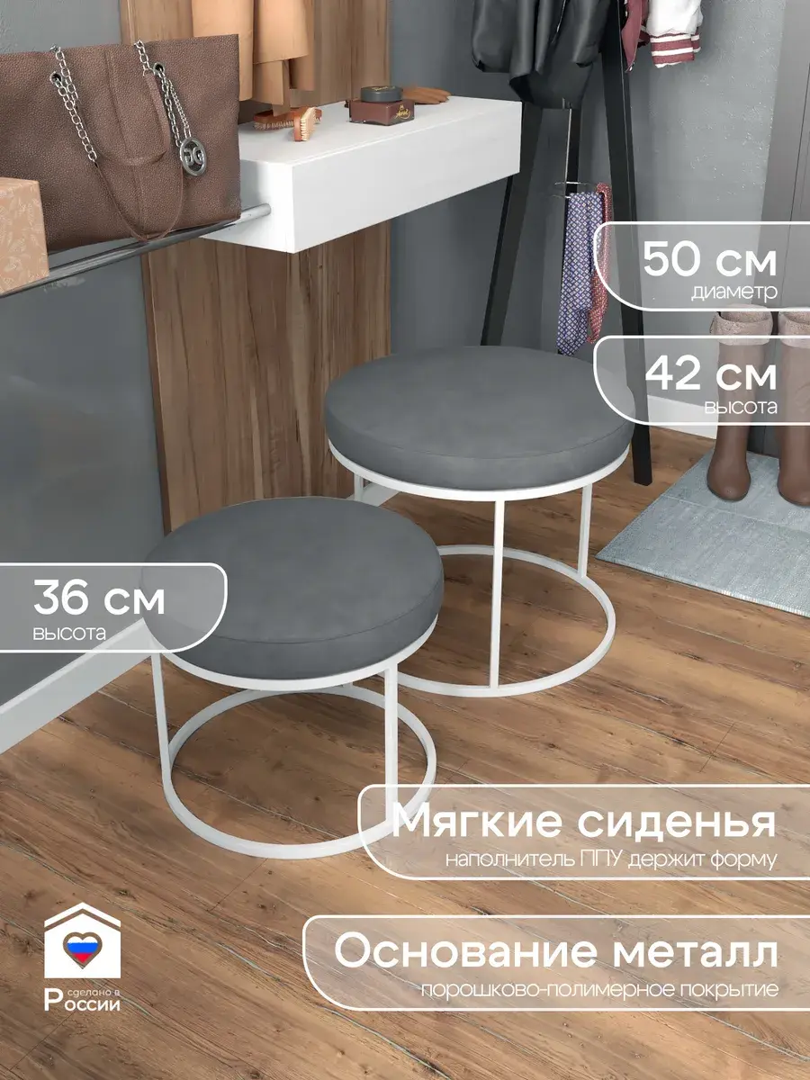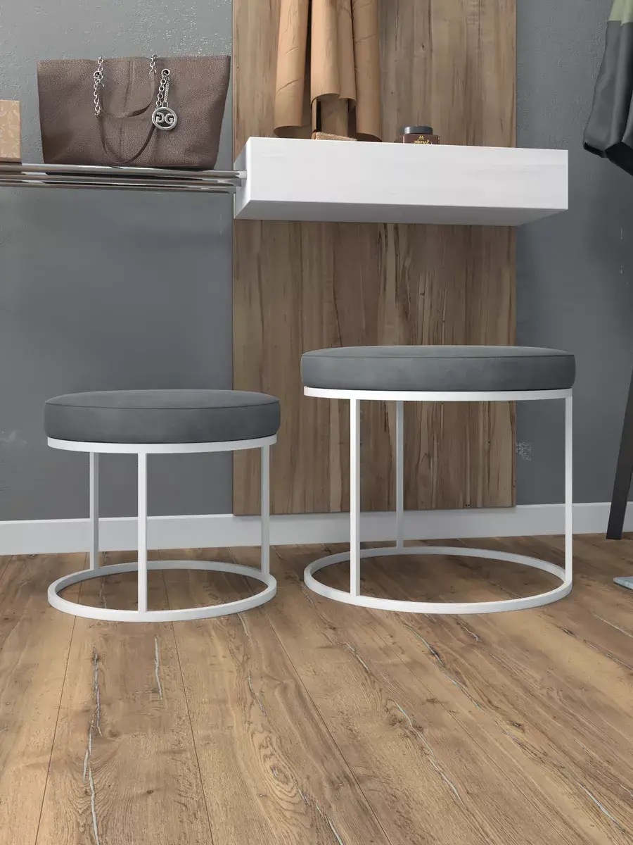 Пара пуфиков для гостиной — это стильный и функциональный предмет мебели. Они имеют прочное металлическое основание и мягкое сиденье, что делает их удобными и долговечными. Металлическое основание обеспечивает надёжность и прочность пуфиков, позволяя использовать их не только как сиденья, но и как небольшие столики или подставки для ног. Их конструкция позволяет легко перемещать пуфики по комнате, делая их универсальным решением для любого интерьера. Мягкая обивка пуфиков изготовлена из высококачественных материалов, которые сохранят свою первоначальную форму и цвет на протяжении долгого времени. Пуфики идеально подходят для гостиной, где они будут стильным акцентом и функциональным элементом. Вы сможете использовать их как дополнительное сиденье для гостей, как подставку для ног или как столик для различных предметов. Благодаря своим компактным размерам, пуфики не займут много места в вашей гостиной и легко впишутся в любой интерьер.