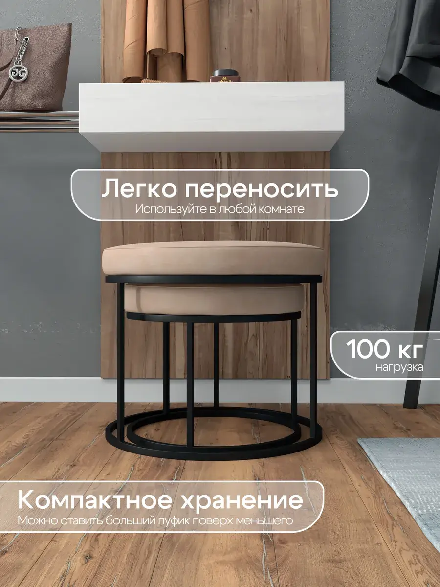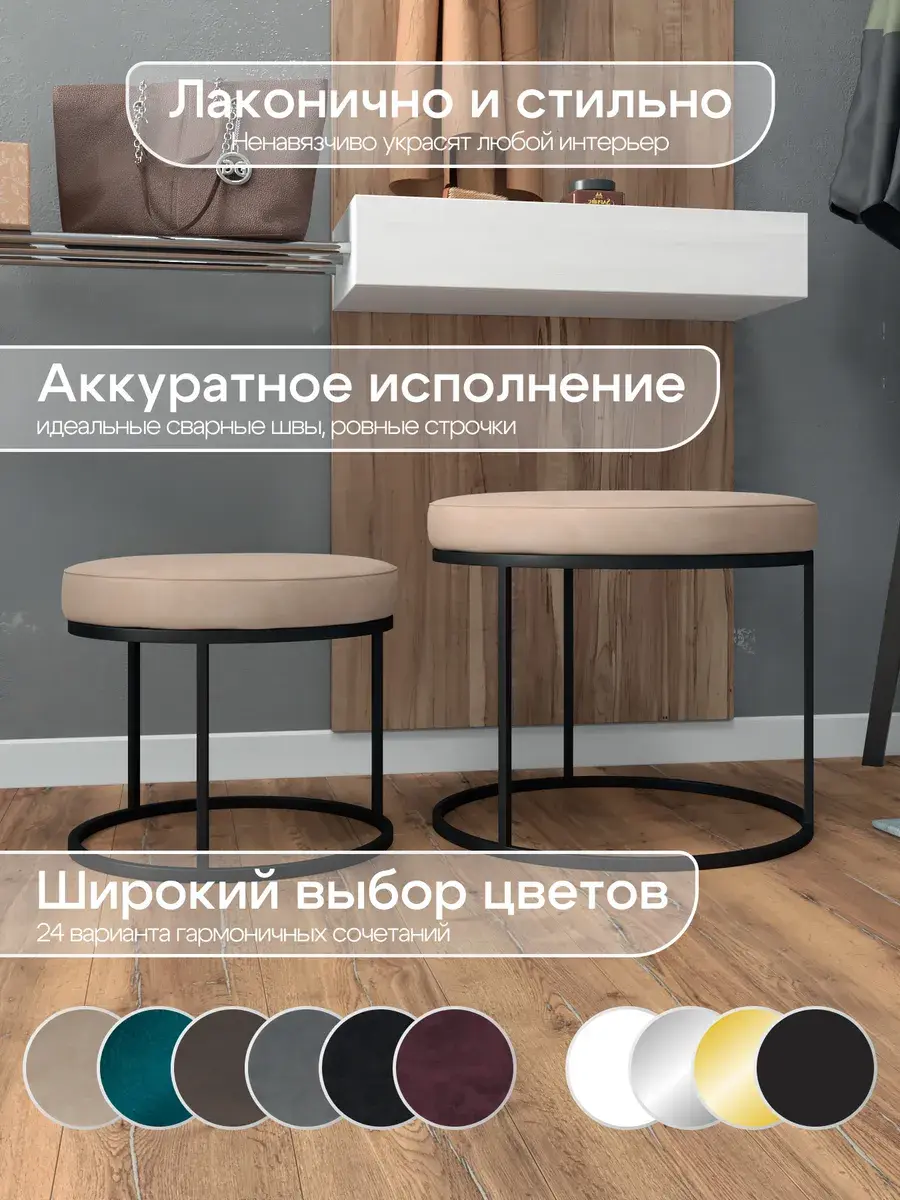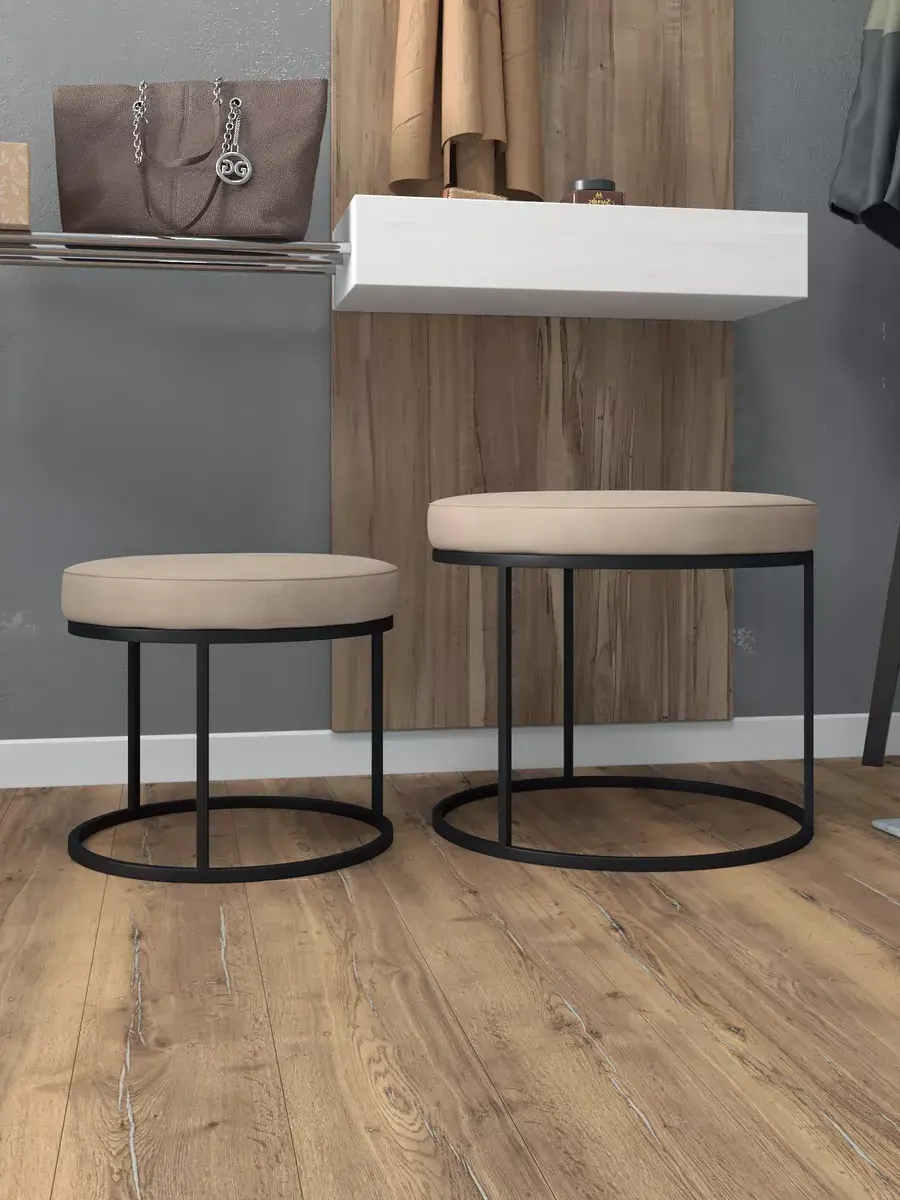 Пара пуфиков для гостиной — это стильный и функциональный предмет мебели. Они имеют прочное металлическое основание и мягкое сиденье, что делает их удобными и долговечными. Металлическое основание обеспечивает надёжность и прочность пуфиков, позволяя использовать их не только как сиденья, но и как небольшие столики или подставки для ног. Их конструкция позволяет легко перемещать пуфики по комнате, делая их универсальным решением для любого интерьера. Мягкая обивка пуфиков изготовлена из высококачественных материалов, которые сохранят свою первоначальную форму и цвет на протяжении долгого времени. Пуфики идеально подходят для гостиной, где они будут стильным акцентом и функциональным элементом. Вы сможете использовать их как дополнительное сиденье для гостей, как подставку для ног или как столик для различных предметов. Благодаря своим компактным размерам, пуфики не займут много места в вашей гостиной и легко впишутся в любой интерьер.
