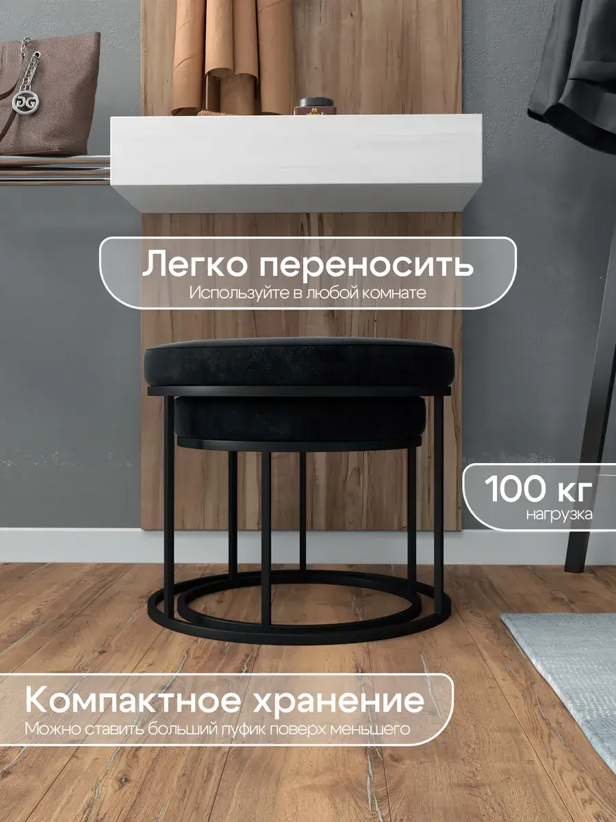 Пара пуфиков для гостиной — это стильный и функциональный предмет мебели. Они имеют прочное металлическое основание и мягкое сиденье, что делает их удобными и долговечными. Металлическое основание обеспечивает надёжность и прочность пуфиков, позволяя использовать их не только как сиденья, но и как небольшие столики или подставки для ног. Их конструкция позволяет легко перемещать пуфики по комнате, делая их универсальным решением для любого интерьера. Мягкая обивка пуфиков изготовлена из высококачественных материалов, которые сохранят свою первоначальную форму и цвет на протяжении долгого времени. Пуфики идеально подходят для гостиной, где они будут стильным акцентом и функциональным элементом. Вы сможете использовать их как дополнительное сиденье для гостей, как подставку для ног или как столик для различных предметов. Благодаря своим компактным размерам, пуфики не займут много места в вашей гостиной и легко впишутся в любой интерьер.