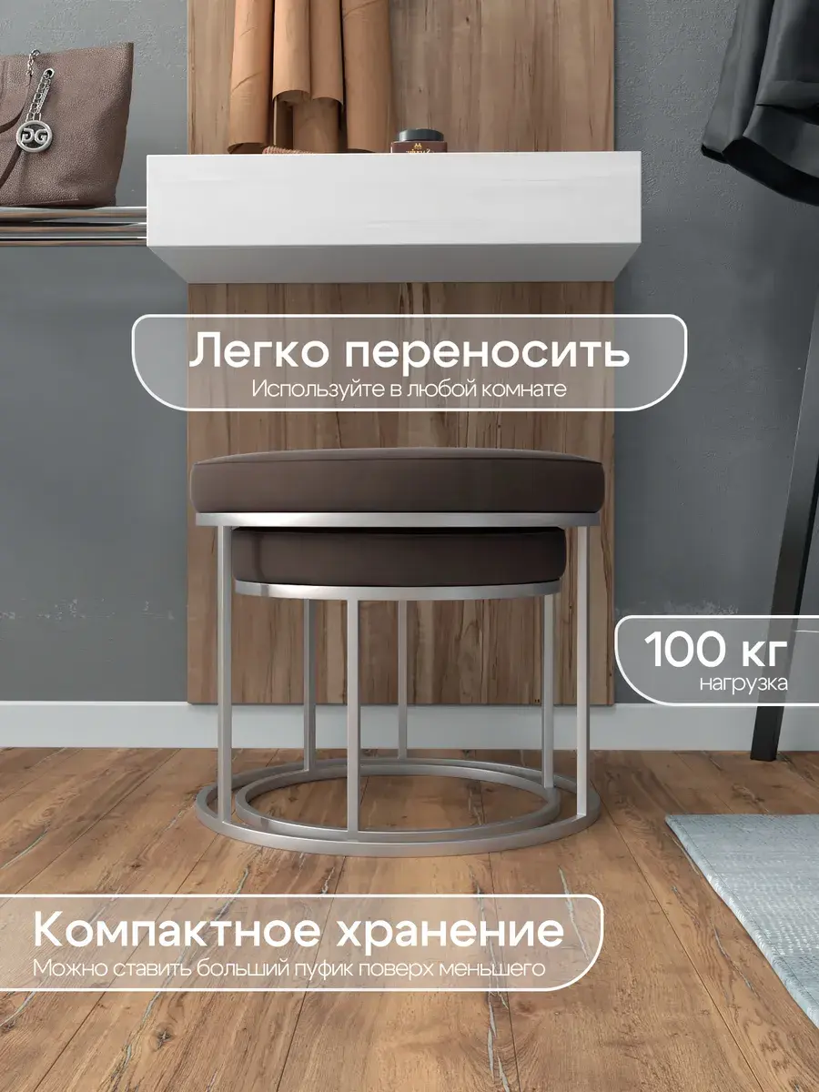 Пара пуфиков для гостиной — это стильный и функциональный предмет мебели. Они имеют прочное металлическое основание и мягкое сиденье, что делает их удобными и долговечными. Металлическое основание обеспечивает надёжность и прочность пуфиков, позволяя использовать их не только как сиденья, но и как небольшие столики или подставки для ног. Их конструкция позволяет легко перемещать пуфики по комнате, делая их универсальным решением для любого интерьера. Мягкая обивка пуфиков изготовлена из высококачественных материалов, которые сохранят свою первоначальную форму и цвет на протяжении долгого времени. Пуфики идеально подходят для гостиной, где они будут стильным акцентом и функциональным элементом. Вы сможете использовать их как дополнительное сиденье для гостей, как подставку для ног или как столик для различных предметов. Благодаря своим компактным размерам, пуфики не займут много места в вашей гостиной и легко впишутся в любой интерьер.